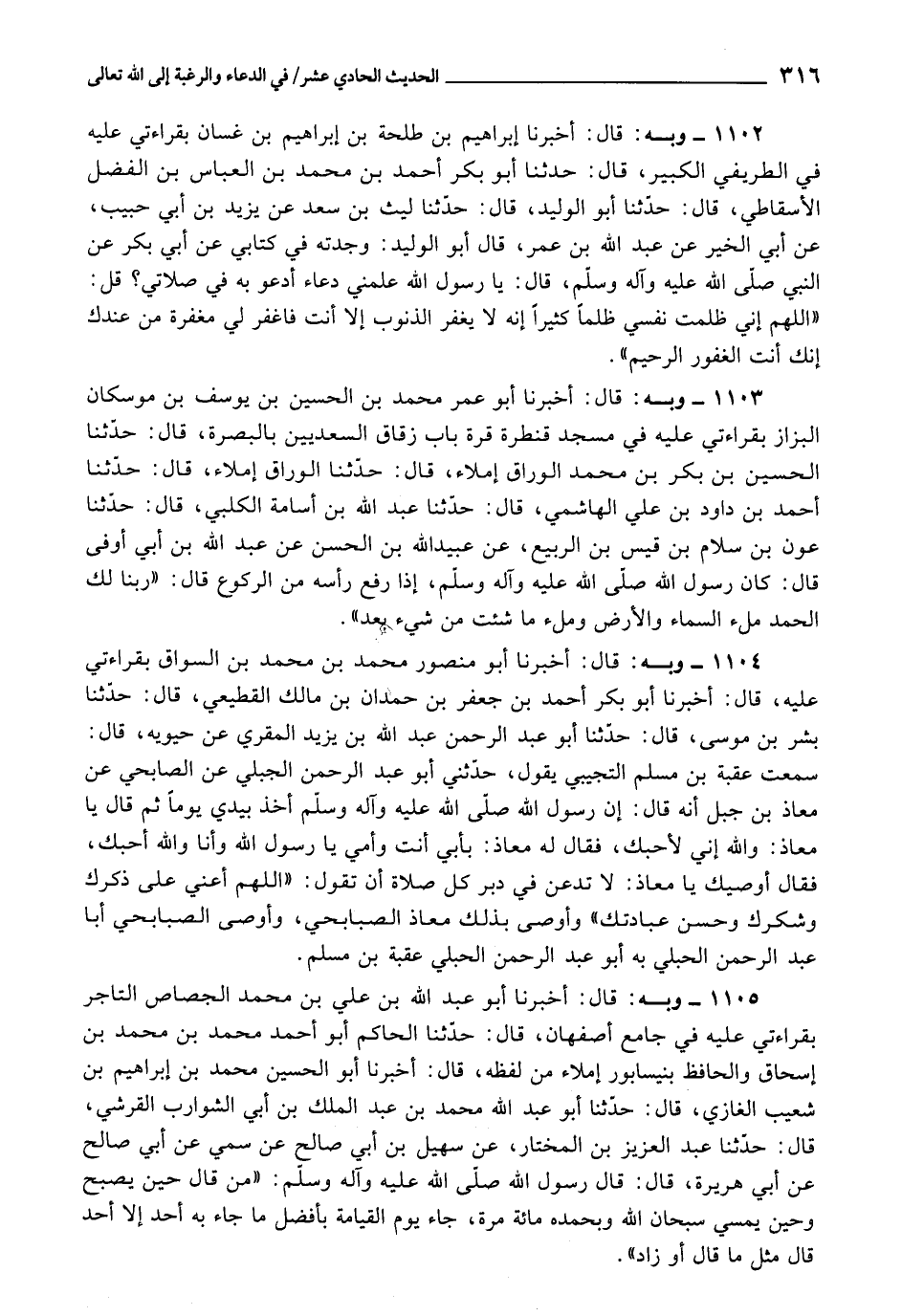 1102 - أَخْبَرَنَا إِبْرَاهِيمُ بْنُ طَلْحَةَ بْنِ إِبْرَاهِيمَ بْنِ غَسَّانَ، بِقِرَاءَتِي عَلَيْهِ فِي الطَّرِيفِيِّ الْكَبِيرِ، قَالَ: حَدَّثَنَا أَبُو بَكْرٍ أَحْمَدُ بْنُ مُحَمَّدِ بْنِ الْعَبَّاسِ بْنِ الْفَضْلِ الْأَسْقَاطِيُّ، قَالَ: حَدَّثَنَا أَبُو الْوَلِيدِ، قَالَ: حَدَّثَنَا لَيْثُ بْنُ سَعْدٍ، عَنْ يَزِيدَ بْنِ أَبِي حَبِيبٍ، عَنْ أَبِي الْخَيْرِ، عَنْ عَبْدِ اللَّهِ بْنِ عُمَرَ، قَالَ أَبُو الْوَلِيدِ وَجَدْتُهُ فِي كِتَابِي، عَنْ أَبِي بَكْرٍ، عَنِ النَّبِيِّ صَلَّى اللَّهُ عَلَيْهِ وَآلِهِ وَسَلَّمَ، قَالَ: يَا رَسُولَ اللَّهِ، عَلِّمْنِي دُعَاءً أَدْعُو بِهِ فِي صَلَاتِي قَالَ: " قُلْ: اللَّهُمَّ إِنِّي ظَلَمْتُ نَفْسِي كَثِيرًا، إِنَّهُ لَا يَغْفِرُ الذُّنُوبَ إِلَّا أَنْتَ، فَاغْفِرْ لِي مَغْفِرَةً مِنْ عِنْدِكَ إِنَّكَ أَنْتَ الْغَفُورُ الرَّحِيمُ "