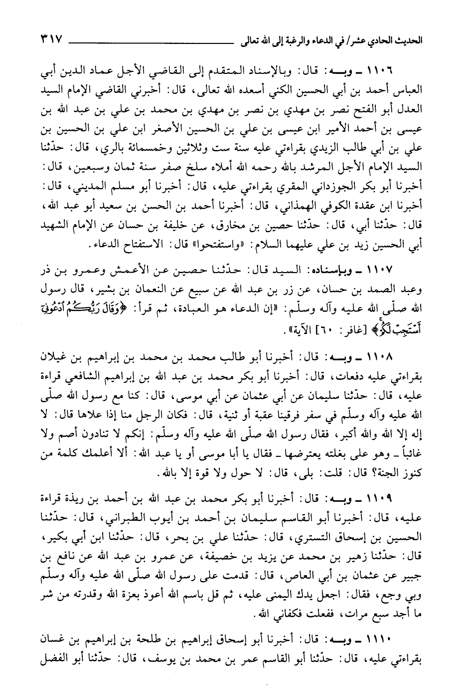 1106 - أَخْبَرَنَا أَبُو بَكْرٍ الْجُوزَدَانِيُّ الْمُقْرِيُّ، بِقِرَاءَتِي عَلَيْهِ، قَالَ: أَخْبَرَنَا أَبُو مُسْلِمٍ الْمَدِينِيُّ، قَالَ: أَخْبَرَنَا ابْنُ عُقْدَةَ الْكُوفِيُّ الْهَمَذَانِيُّ، قَالَ: أَخْبَرَنَا أَحْمَدُ بْنُ الْحَسَنِ بْنِ سَعِيدٍ أَبُو عَبْدِ اللَّهِ، قَالَ: حَدَّثَنَا أَبِي، قَالَ: حَدَّثَنَا حُصَيْنُ بْنُ مُخَارِقٍ، عَنْ خَلِيفَةَ بْنِ حَسَّانٍ، عَنِ الْإِمَامِ الشَّهِيدِ أَبِي الْحُسَيْنِ زَيْدِ بْنِ عَلِيٍّ، عَلَيْهِمَا السَّلَامُ " {وَاسْتَفْتَحُوا} [إبراهيم: 15] قَالَ: الِاسْتِفْتَاحُ الدُّعَاءُ ".