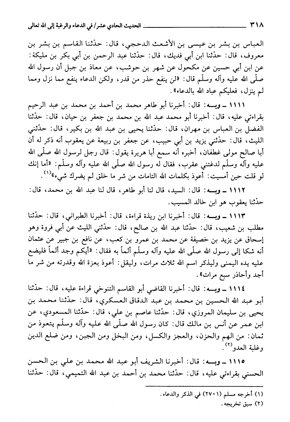 الْعَبَّاسُ بْنُ بِشْرِ بْنِ عِيسَى بْنِ الْأَشْعَثِ الدَّحَجِيُّ، قَالَ: حَدَّثَنَا الْقَاسِمُ بْنُ بِشْرِ بْنِ مَعْرُوفٍ، قَالَ: حَدَّثَنَا ابْنُ أَبِي فُدَيْكٍ، قَالَ: حَدَّثَنَا عَبْدُ الرَّحْمَنِ بْنُ أَبِي بَكْرِ بْنِ مَلِيكَةَ، عَنِ ابْنِ أَبِي حُسَيْنٍ، عَنْ مَكْحُولٍ، عَنْ شَهْرِ بْنِ حَوْشَبٍ، عَنْ مُعَاذِ بْنِ جَبَلٍ، أَنّ رَسُولَ اللَّهِ صَلَّى اللَّهِ عَلَيْهِ وَآلِهِ وَسَلَّمَ، قَالَ: «لَنْ يَنْفَعَ حَذَرٌ مِنْ قَدَرٍ، وَلَكِنَّ الدُّعَاءَ يَنْفَعُ مِمَّا نَزَلَ وَمِمَّا لَمْ يَنْزِلْ، فَعَلَيْكُمْ عِبَادَ اللَّهِ بِالدُّعَاءِ»