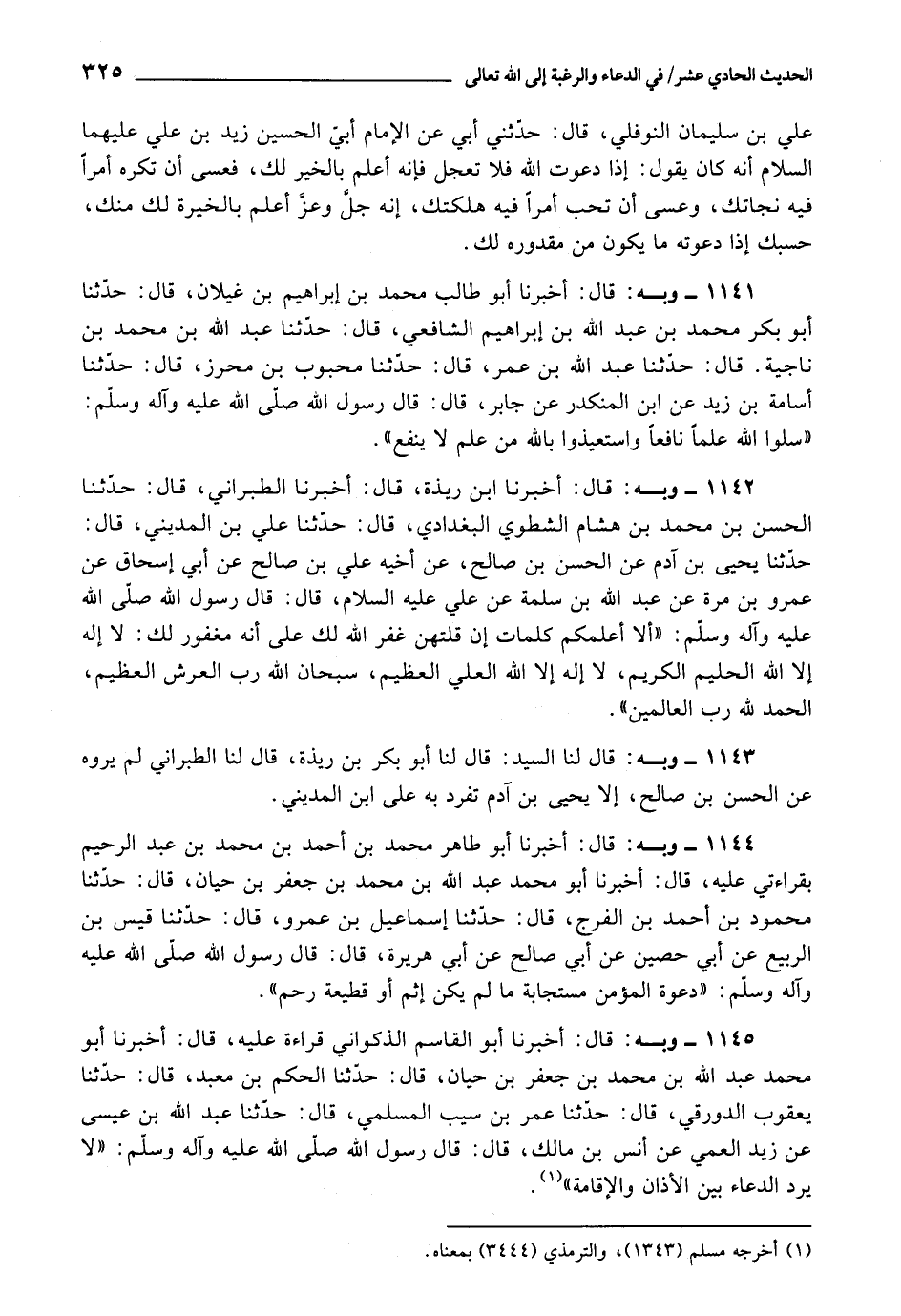 عَلِيُّ بْنُ سُلَيْمَانَ النَّوْفَلِيُّ، قَالَ: حَدَّثَنِي أَبِي، عَنِ الْإِمَامِ أَبِي الْحُسَيْنِ زَيْدِ بْنِ عَلِيٍّ، عَلَيْهِمَا السَّلَامُ أَنَّهُ كَانَ يَقُولُ: «إِذَا دَعَوْتَ اللَّهَ فَلَا تَعْجَلْ فَإِنَّهُ أَعْلَمُ بِالْخَيْرِ لَكَ، فَعَسَى أَنْ تَكْرَهَ أَمْرًا فِيهِ نَجَاتُكَ، وَعَسَى أَنْ تُحِبَّ أَمْرًا فِيهِ هَلَكَتُكَ، إِنَّهُ جَلَّ وَعَزَّ أَعْلَمُ بِالْخَيْرِ لَكَ مِنْكَ، حَسْبُكَ إِذَا دَعَوْتَهُ مَا يَكُونُ مِنْ مَقْدُورِهِ لَكَ» .