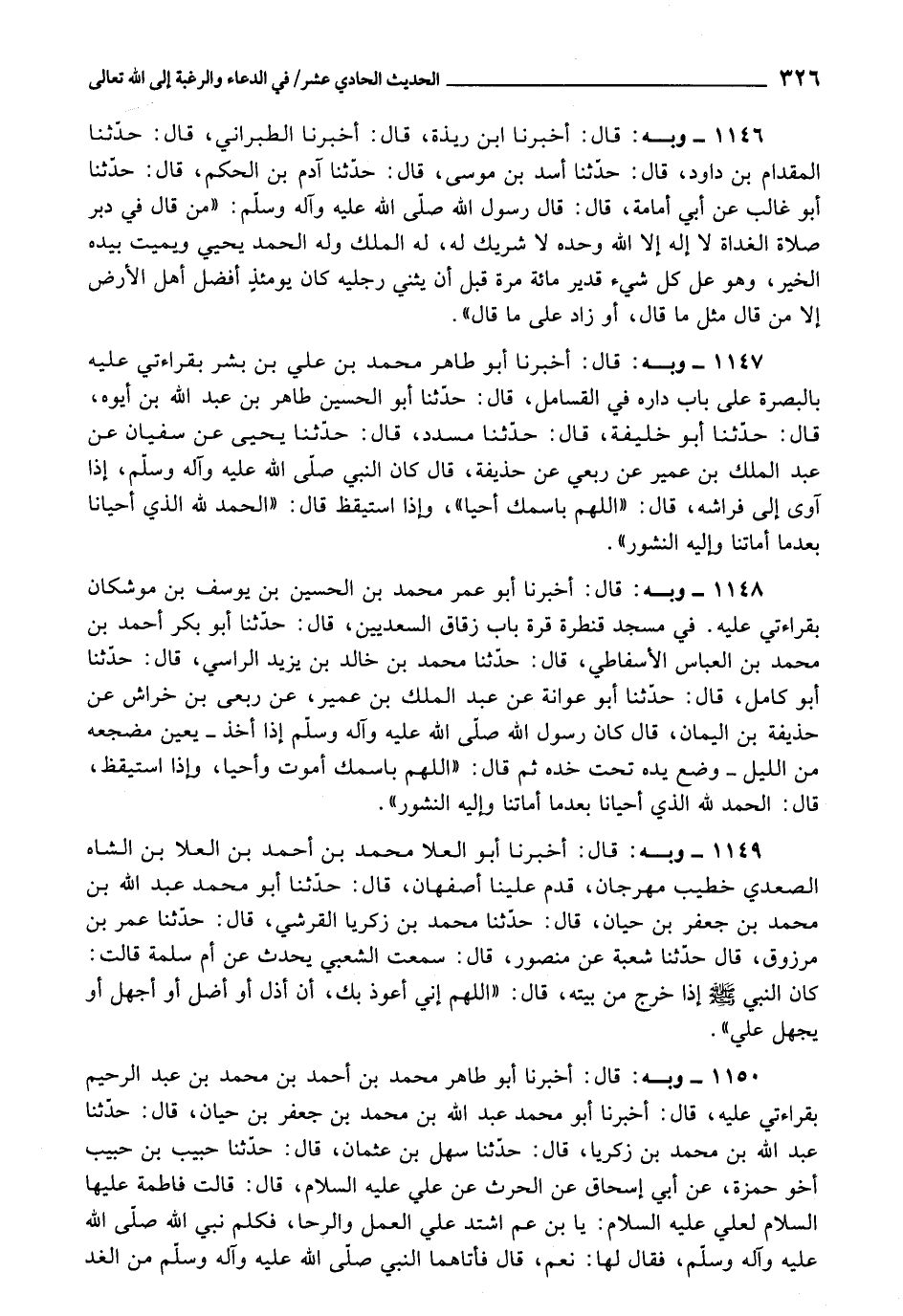 1147 - أَخْبَرَنَا أَبُو طَاهِرٍ مُحَمَّدُ بْنُ أَحْمَدَ بْنِ مُحَمَّدِ بْنِ عَبْدِ الرَّحِيمِ، بِقِرَاءَتِي عَلَيْهِ بِالْبَصْرَةِ عَلَى بَابِ دَارِهِ فِي الْقَسَامِلِ، قَالَ: حَدَّثَنَا أَبُو الْحُسَيْنِ طَاهِرُ بْنُ عَبْدِ اللَّهِ بْنِ أَيُّوهْ، قَالَ: حَدَّثَنَا أَبُو خَلِيفَةَ، قَالَ: حَدَّثَنَا مُسَدَّدٌ، قَالَ: حَدَّثَنَا يَحْيَى، عَنْ سُفْيَانَ، عَنْ عَبْدِ الْمَلِكِ بْنِ عُمَيْرٍ، عَنْ رِبْعِيٍّ، عَنْ حُذَيْفَةَ، قَالَ: كَانَ النَّبِيُّ صَلَّى اللَّهُ عَلَيْهِ وَآلِهِ وَسَلَّمَ، إِذَا آوَى إِلَى فِرَاشِهِ، قَالَ: «اللَّهُمَّ بِاسْمِكَ أَحْيَا» ، وَإِذَا اسْتَيْقَظَ، قَالَ: «الْحَمْدُ لِلَّهِ الَّذِي أَحْيَانَا بَعْدَمَا أَمَاتَنَا وَإِلَيْهِ النُّشُورُ»