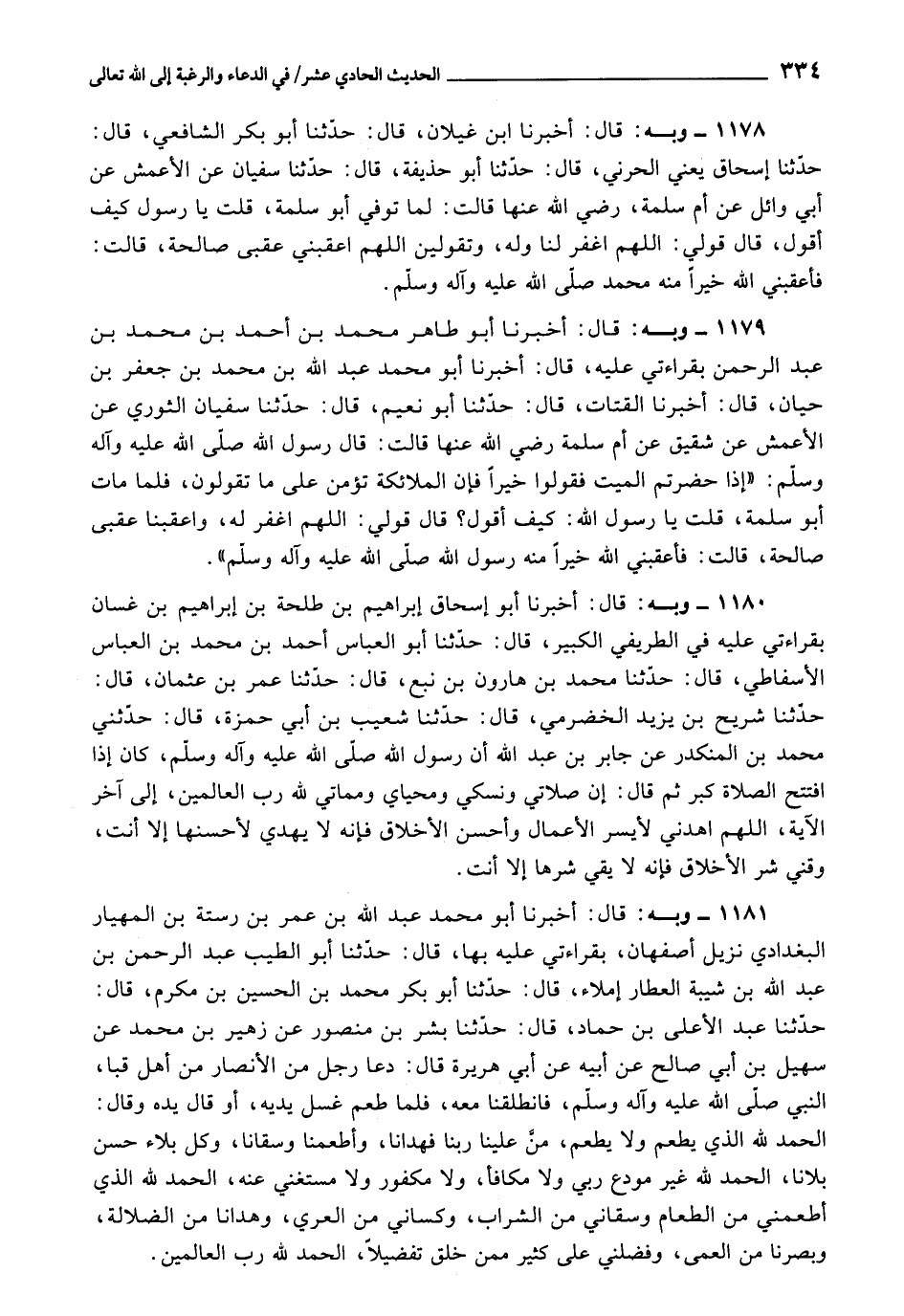 1181 - أَخْبَرَنَا أَبُو مُحَمَّدٍ عَبْدُ اللَّهِ بْنُ عُمَرَ بْنِ رُسْتَةَ الْمِهْيَارُ الْبَغْدَادِيُّ، نَزِيلُ أَصْفَهَانَ، بِقِرَاءَتِي عَلَيْهِ بِهَا، قَالَ: حَدَّثَنَا أَبُو الطَّيِّبِ عَبْدُ الرَّحْمَنِ بْنُ عَبْدِ اللَّهِ بْنِ شَيْبَةَ الْعَطَّارُ، إِمْلَاءً، قَالَ: حَدَّثَنَا أَبُو بَكْرٍ مُحَمَّدُ بْنُ الْحُسَيْنِ بْنُ مُكْرَمٍ، قَالَ: حَدَّثَنَا عَبْدُ الْأَعْلَى بْنُ حَمَّادٍ، قَالَ: حَدَّثَنَا بِشْرُ بْنُ مَنْصُورٍ، عَنْ زُهَيْرِ بْنِ مُحَمَّدٍ، عَنْ سُهَيْلِ بْنِ أَبِي صَالِحٍ، عَنْ أَبِيهِ، عَنْ أَبِي هُرَيْرَةَ، قَالَ: دَعَا رَجُلٌ مِنَ الْأَنْصَارِ مِنْ أَهْلِ قُبَا النَّبِيَّ صَلَّى اللَّهُ عَلَيْهِ وَآلِهِ وَسَلَّمَ، فَانْطَلَقْنَا مَعَهُ، فَلَمَّا طَعِمَ غَسَلَ يَدَيْهِ، أَوْ قَالَ يَدَهُ وَقَالَ: «الْحَمْدُ لِلَّهِ الَّذِي يُطْعِمُ وَلَا يُطْعَمُ، مَنَّ عَلَيْنَا رَبُّنَا فَهَدَانَا، وَأَطْعَمَنَا وَسَقَانَا، وَكُلَّ بَلَاءٍ حَسَنٍ بَلَانَا، الْحَمْدُ لِلَّهِ غَيْرَ مُوَدَّعٍ رَبِّي وَلَا مُكَافَإٍ، وَلَا مَكْفُورٍ وَلَا مُسْتَغْنًى عَنْهُ، الْحَمْدُ لِلَّهِ الَّذِي أَطْعَمَنِي مِنَ الطَّعَامِ وَسَقَانِي مِنَ الشَّرَابِ، وَكَسَانِي مِنَ الْعُرْيِ، وَهَدَانَا مِنَ الضَّلَالَةِ وَبَصَّرَنَا مِنَ الْعَمَى، وَفَضَّلَنِي عَلَى كَثِيرٍ مِمَّنْ خَلَقَ تَفْضِيلًا، الْحَمْدُ لِلَّهِ رَبِّ الْعَالَمِينَ» .