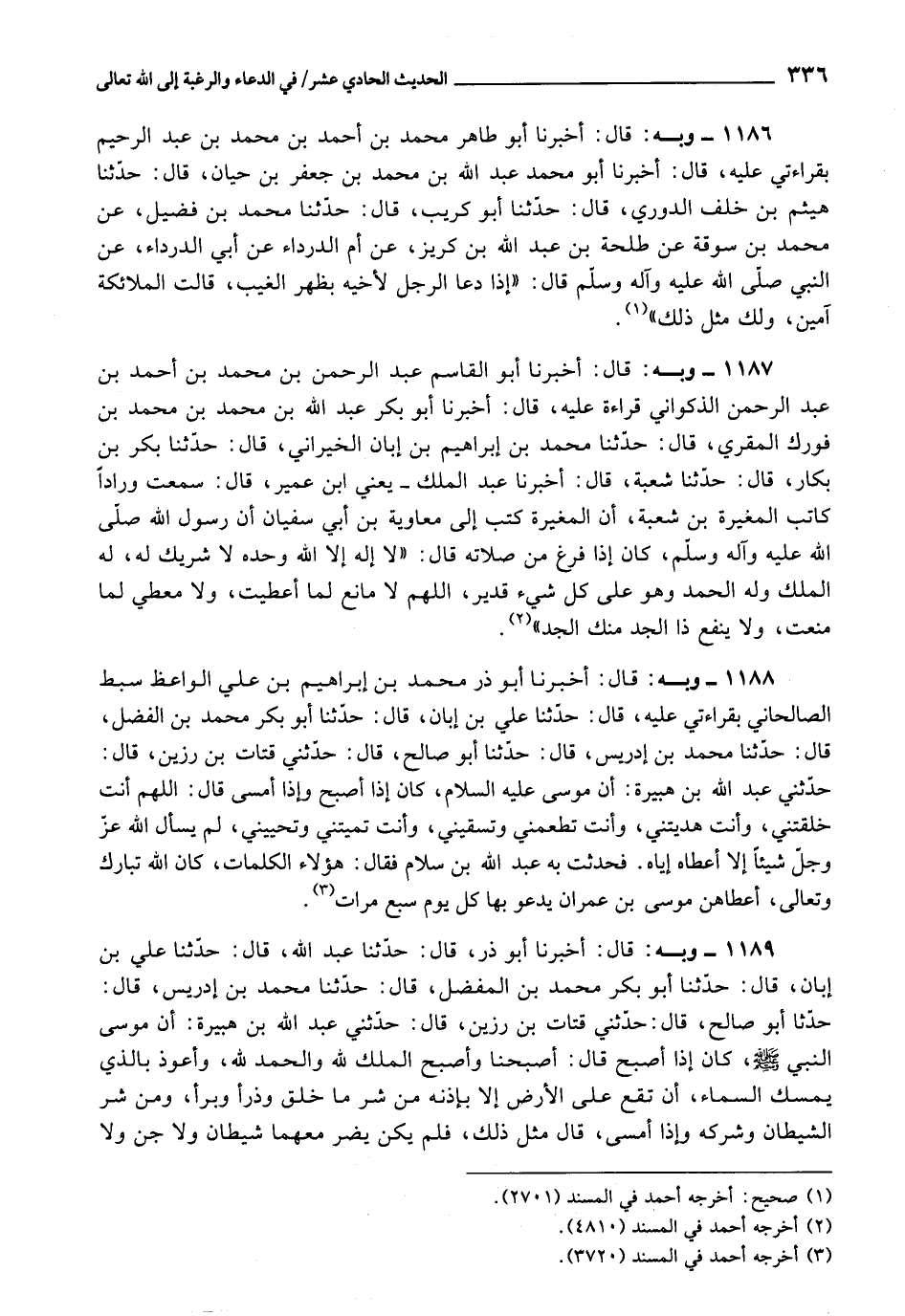 1186 - أَخْبَرَنَا أَبُو طَاهِرٍ مُحَمَّدُ بْنُ أَحْمَدَ بْنِ مُحَمَّدِ بْنِ عَبْدِ الرَّحِيمِ، بِقِرَاءَتِي عَلَيْهِ، قَالَ: أَبُو مُحَمَّدٍ عَبْدُ اللَّهِ بْنُ مُحَمَّدِ بْنِ جَعْفَرِ بْنِ حَيَّانَ، قَالَ: هَيْثَمُ بْنُ خَلَفٍ الدُّورِيُّ، قَالَ: حَدَّثَنَا أَبُو كُرَيْبٍ، قَالَ: حَدَّثَنَا مُحَمَّدُ بْنُ فُضَيْلٍ، عَنْ مُحَمَّدِ بْنِ سُوقَةَ، عَنْ طَلْحَةَ بْنِ عَبْدِ اللَّهِ بْنِ كُرَيْزٍ، عَنْ أُمِّ الدَّرْدَاءِ، عَنْ أَبِي الدَّرْدَاءِ، عَنِ النَّبِيِّ صَلَّى اللَّهُ عَلَيْهِ وَآلِهِ وَسَلَّمَ، قَالَ: " إِذَا دَعَا الرَّجُلُ لِأَخِيهِ بِظَهْرِ الْغَيْبِ، قَالَتِ الْمَلَائِكَةُ: آمِينَ، وَلَكَ مِثْلُ ذَلِكَ "