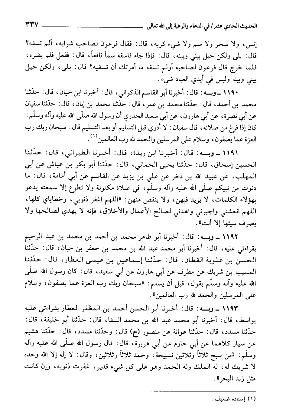 1192 - أَخْبَرَنَا أَبُو طَاهِرٍ مُحَمَّدُ بْنُ أَحْمَدَ بْنِ مُحَمَّدِ بْنِ عَبْدِ الرَّحِيمِ، بِقِرَاءَتِي عَلَيْهِ، قَالَ: أَخْبَرَنَا أَبُو مُحَمَّدٍ عَبْدُ اللَّهِ بْنُ مُحَمَّدِ بْنِ جَعْفَرِ بْنِ حَيَّانَ، قَالَ: حَدَّثَنَا الْحَسَنُ بْنُ عَلُّوَيْهِ الْقَطَّانُ، قَالَ: حَدَّثَنَا إِسْمَاعِيلُ بْنُ عِيسَى الْعَطَّارُ، قَالَ: حَدَّثَنَا الْمُسَيَّبُ بْنُ شَرِيكٍ، عَنْ مُطَرِّفٍ، عَنْ أَبِي هَارُونَ، عَنْ أَبِي سَعِيدٍ، قَالَ: كَانَ رَسُولُ اللَّهِ صَلَّى اللَّهُ عَلَيْهِ وَآلِهِ وَسَلَّمَ يَقُولُ قَبْلَ أَنْ يُسَلِّمَ: " {سُبْحَانَ رَبِّكَ رَبِّ الْعِزَّةِ عَمَّا يَصِفُونَ {180} وَسَلامٌ عَلَى الْمُرْسَلِينَ {181} وَالْحَمْدُ لِلَّهِ رَبِّ الْعَالَمِينَ} [الصافات: 180-182] "