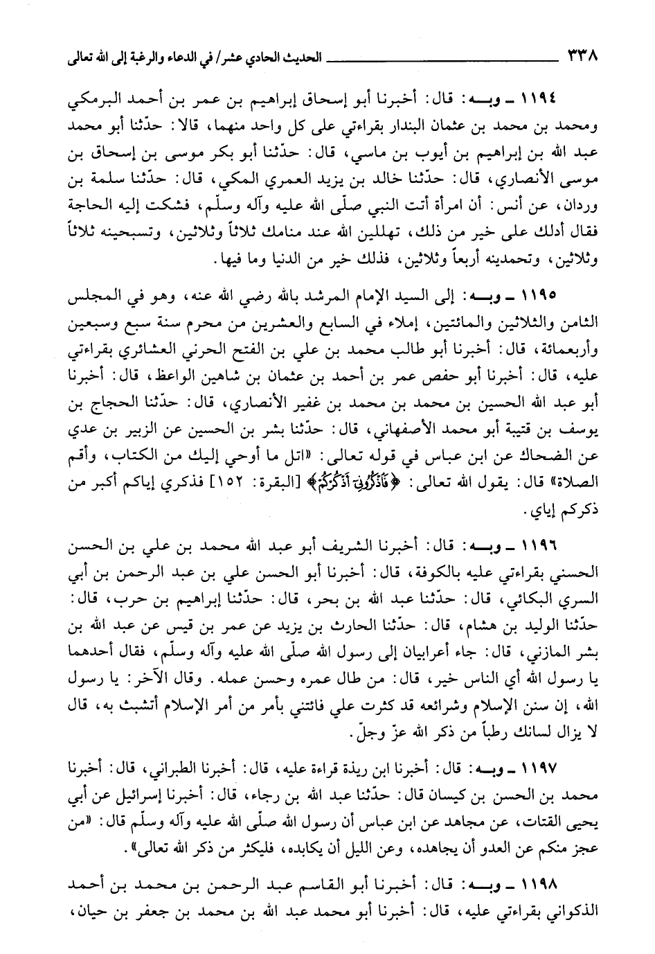 1196 - أَخْبَرَنَا الشَّرِيفُ أَبُو عَبْدِ اللَّهِ مُحَمَّدُ بْنُ عَلِيِّ بْنِ الْحَسَنِ الْحَسَنِيُّ، بِقِرَاءَتِي عَلَيْهِ بِالْكُوفَةِ، قَالَ: أَخْبَرَنَا أَبُو الْحَسَنِ عَلِيُّ بْنُ عَبْدِ الرَّحْمَنِ بْنِ أَبِي السَّرِيِّ الْبَكَّائِيُّ، قَالَ: حَدَّثَنَا عَبْدُ اللَّهِ بْنُ بَحْرٍ، قَالَ: حَدَّثَنَا إِبْرَاهِيمُ بْنُ حَرْبٍ، قَالَ: حَدَّثَنَا الْوَلِيدُ بْنُ هِشَامٍ، قَالَ: حَدَّثَنَا الْحَارِثُ بْنُ يَزِيدَ، عَنْ عُمَرَ بْنِ قَيْسٍ، عَنْ عَبْدِ اللَّهِ بْنِ بِشْرٍ الْمَازِنِيِّ، قَالَ: جَاءَ أَعْرَابِيَّانِ إِلَى رَسُولِ اللَّهِ صَلَّى اللَّهُ عَلَيْهِ وَآلِهِ وَسَلَّمَ، فَقَالَ أَحَدُهُمَا: يَا رَسُولَ اللَّهِ، أَيُّ النَّاسِ خَيْرٌ، قَالَ: «مَنْ طَالَ عُمْرُهُ وَحَسُنَ عَمَلُهُ» ، وَقَالَ الْآخَرُ: يَا رَسُولَ اللَّهِ، إِنَّ سُنَنَ الْإِسْلَامِ وَشَرَائِعَهُ قَدْ كَثُرَتْ عَلَيَّ فَائْتِنِي بِأَمْرٍ مِنْ أَمْرِ الْإِسْلَامِ أَتَشَبَّثُ بِهِ، قَالَ: «لَا يَزَالُ لِسَانُكَ رَطْبًا بِذِكْرِ اللَّهِ عَزَّ وَجَلَّ»