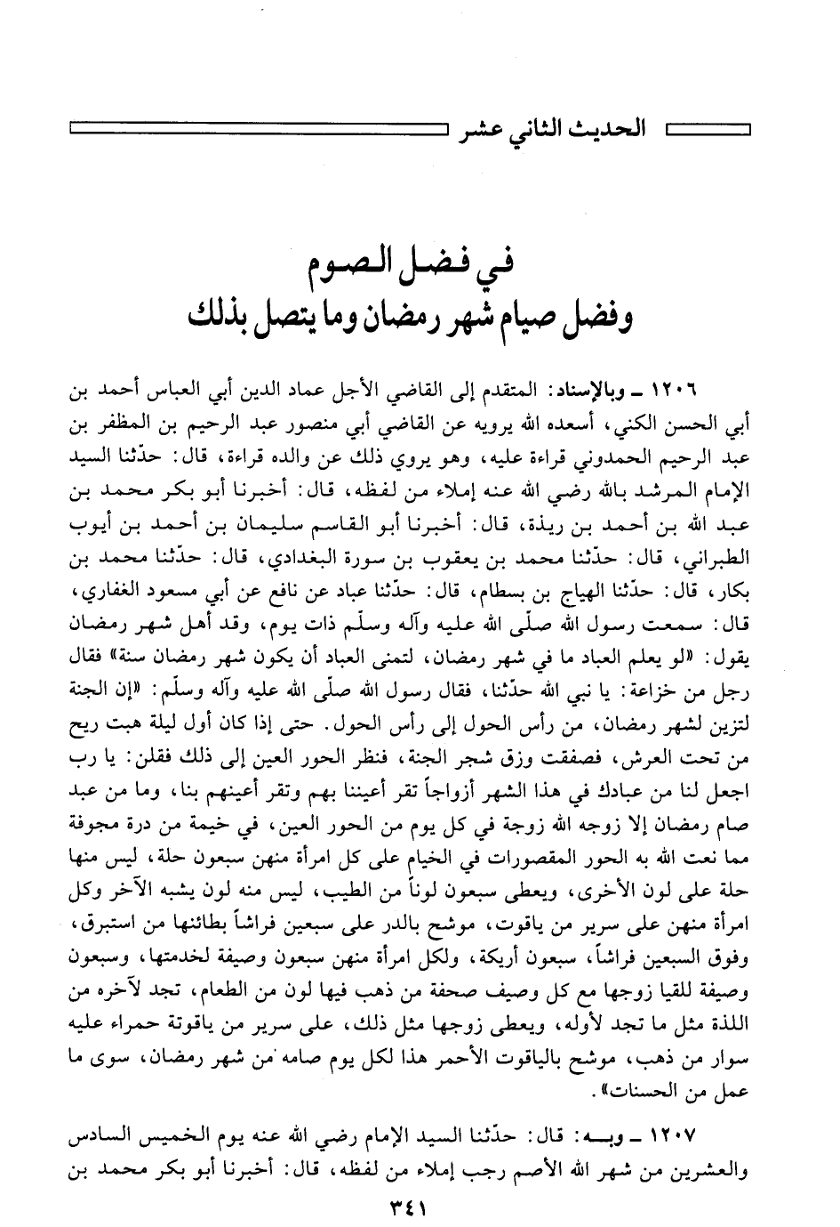 1206 - أَخْبَرَنَا أَبُو بَكْرٍ مُحَمَّدُ بْنُ عَبْدِ اللَّهِ بْنِ أَحْمَدَ بْنِ رَيْذَةَ، قَالَ: أَخْبَرَنَا أَبُو الْقَاسِمِ سُلَيْمَانُ بْنُ أَحْمَدَ بْنِ أَيُّوبَ الطَّبَرانِيُّ، قَالَ: حَدَّثَنَا مُحَمَّدُ بْنُ يَعْقُوبَ بْنِ سَوْرَةَ الْبَغْدَادِيُّ، قَالَ: حَدَّثَنَا مُحَمَّدُ بْنُ بَكَّارٍ، قَالَ: حَدَّثَنَا الْهَيَّاجُ بْنُ بِسْطَانَ، قَالَ: حَدَّثَنَا عَبَّادٌ، عَنْ نَافِعٍ، عَنْ أَبِي مَسْعُودٍ الْغِفَارِيِّ، قَالَ: سَمِعْتُ رَسُولَ اللَّهِ صَلَّى اللَّهُ عَلَيْهِ وَآلِهِ وَسَلَّمَ ذَاتَ يَوْمٍ، وَقَدْ أَهَلَّ شَهْرُ رَمَضَانَ، يَقُولُ: «لَوْ يَعْلَمُ الْعِبَادُ مَا فِي شَهْرِ رَمَضَانَ، لَتَمَنَّى الْعِبَادُ أَنْ يَكُونَ شَهْرُ رَمَضَانَ سَنَةً» ، فَقَالَ رَجُلٌ مِنْ خُزَاعَةَ: يَا نَبِيَّ اللَّهِ، حَدِّثْنَا، فَقَالَ رَسُولُ اللَّهِ صَلَّى اللَّهُ عَلَيْهِ وَآلِهِ وَسَلَّمَ: " إِنَّ الْجَنَّةَ لَتَزَيَّنُ لِشَهْرِ رَمَضَانَ مِنْ رَأْسِ الْحَوْلِ إِلَى رَأْسِ الْحَوْلِ، حَتَّى إِذَا كَانَ أَوَّلُ لَيْلَةٍ هَبَّتْ رِيحٌ مِنْ تَحْتِ الْعَرْشِ، فَصَفَّقَتْ وَرَقُ شَجَرِ الْجَنَّةِ، فَنَظَرَ الْحُورُ الْعِينُ إِلَى ذَلِكَ فَقُلْنَ: يَا رَبِّ، اجْعَلْ لَنَا مِنْ عِبَادِكَ فِي هَذَا الشَّهْرِ أَزْوَاجًا تَقَرُّ أَعْيُنُنَا بِهِمْ وَتَقَرُّ أَعْيُنُهُمْ بِنَا، وَمَا مِنْ عَبْدٍ صَامَ رَمَضَانَ إِلَّا زَوُّجَهُ اللَّهُ زَوْجَةً فِي كُلِّ يَوْمٍ مِنَ الْحُورِ الْعِينِ، فِي خَيْمَةٍ مِنْ دُرَّةٍ مُجَوَّفَةٍ مِمَّا نَعَتَ اللَّهُ بِهِ الْحُورَ الْمَقْصُورَاتِ فِي الْخِيَامِ عَلَى كُلِّ امْرَأَةٍ مِنْهُنَّ سَبْعُونَ حُلَّةٍ لَيْسَ مِنْهَا حُلَّةٌ عَلَى لَوْنِ الْأُخْرَى، وَيُعْطَى سَبْعُون لَوْنًا مِنَ الطِّيبِ، لَيْسَ مِنْهُ لَوْنٌ يُشْبِهُ الْآخَرِ، وَكُلُّ امْرَأَةٍ مِنْهُنَّ عَلَى سَرِيرٍ مِنْ يَاقُوتٍ، مُوَشَّحٍ بِالدُّرِّ عَلَى سَبْعِينَ فِرَاشًا بَطَائِنُهَا مِنْ إِسْتَبْرَقٍ، وَفَوْقَ السَّبْعِينَ فِرَاشًا، سَبْعُونَ أَرِيكَةً، وَلِكُلِّ امْرَأَةٍ مِنْهُنَّ سَبْعُونَ وَصِيفَةً، لِخِدْمَتِهَا، وَسَبْعُونَ وَصِيفَةً لِلُقْيَا زَوْجِهَا مَعَ كُلِّ وَصِيفَةٍ صَحْفَةٌ مِنْ ذَهَبٍ فِيهَا لَوْنٌ مِنَ الطَّعَامِ، تَجِدُ لِآخِرِهِ مِنَ اللَّذَّةِ مِثْلَ مَا تَجِدُهُ لِأَوَّلِهِ، وَيُعْطَى زَوْجُهَا مِثْلَ ذَلِكَ، عَلَى سَرِيرٍ مِنْ يَاقُوتَةٍ حَمْرَاءَ عَلَيْهِ سِوَارٌ مِنْ ذَهَبٍ، مُوَشَّحٌ بِالْيَاقُوتِ الْأَحْمَرِ هَذَا لِكُلِّ يَوْمٍ صَامَهُ مِنْ شَهْرِ