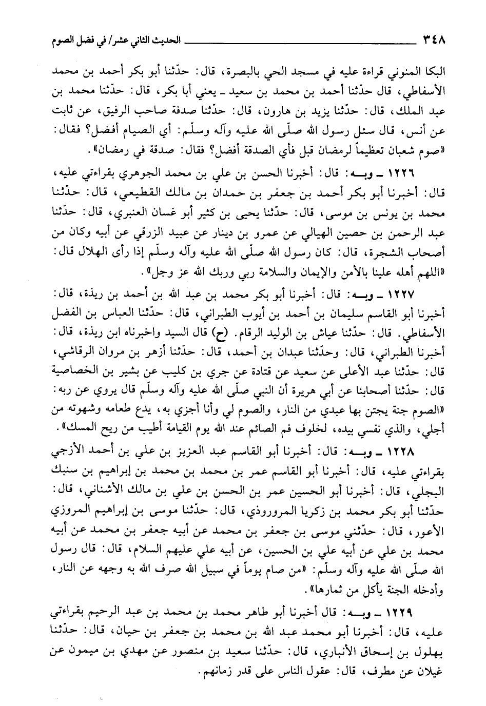 1228 - أَخْبَرَنَا أَبُو الْقَاسِمِ عَبْدُ الْعَزِيزِ بْنُ عَلِيِّ بْنِ أَحْمَدَ الْأَزَجِيُّ، بِقِرَاءَتِي عَلَيْهِ، قَالَ: أَخْبَرَنَا أَبُو الْقَاسِمِ عُمَرُ بْنُ مُحَمَّدِ بْنِ مُحَمَّدِ بْنِ إِبْرَاهِيمَ بْنِ سَنْبَكٍ الْبَجَلِيُّ، قَالَ: أَخْبَرَنَا أَبُو الْحُسَيْنِ عُمَرُ بْنُ الْحَسَنِ بْنِ عَلِيِّ بْنِ مَالِكٍ الْأُشْنَانِيُّ، قَالَ: حَدَّثَنَا أَبُو بَكْرٍ مُحَمَّدُ بْنُ زَكَرِيَّا الْمَرْوَرُّذِيُّ، قَالَ: حَدَّثَنَا مُوسَى بْنُ إِبْرَاهِيمَ الْمَرْوَزِيُّ الْأَعْوَرُ، قَالَ: حَدَّثَنَا مُوسَى بْنُ جَعْفَرِ بْنِ مُحَمَّدٍ، عَنْ أَبِيهِ جَعْفَرِ بْنِ مُحَمَّدٍ، عَنْ أَبِيهِ مُحَمَّدِ بْنِ عَلِيٍّ، عَنْ أَبِيهِ عَلِيِّ بْنِ الْحُسَيْنِ، عَنْ أَبِيهِ عَلِيٍّ عَلَيْهِمُ السَّلَامُ، قَالَ: قَالَ رَسُولُ اللَّهِ صَلَّى اللَّهُ عَلَيْهِ وَآلِهِ وَسَلَّمَ: «مَنْ صَامَ يَوْمًا فِي سَبِيلِ اللَّهِ صَرَفَ اللَّهُ بِهِ وَجْهَهُ عَنِ النَّارِ، وَأَدْخَلَهُ الْجَنَّةَ يَأْكُلُ مِنْ ثِمَارِهَا»