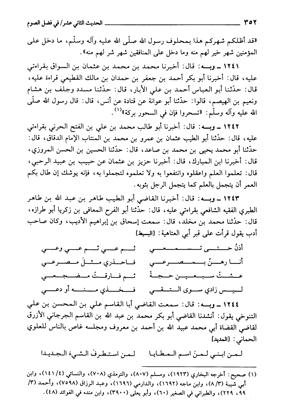 1241 - أَخْبَرَنَا مُحَمَّدُ بْنُ مُحَمَّدِ بْنِ عُثْمَانَ بْنِ السَّوَّاقِ، بِقِرَاءَتِي عَلَيْهِ، قَالَ: أَبُو بَكْرِ بْنِ أَحْمَدَ بْنِ جَعْفَرِ بْنِ حَمْدَانَ بْنِ مَالِكٍ الْقَطِيعِيُّ، قِرَاءَةً عَلَيْهِ، قَالَ: حَدَّثَنَا أَبُو الْعَبَّاسِ أَحْمَدُ بْنُ عَلِيٍّ الْأَبَّارُ، قَالَ: حَدَّثَنَا مُسَدَّدٌ، وَجِلْفُ بْنُ هِشَامٍ، وَنُعَيْمُ بْنُ الْهَيْصَمِ، قَالُوا: حَدَّثَنَا أَبُو عَوَانَةَ، عَنْ قَتَادَةَ، عَنْ أَنَسٍ، قَالَ: قَالَ رَسُولُ اللَّهِ صَلَّى اللَّهُ عَلَيْهِ وَآلِهِ وَسَلَّمَ: «تَسَحَّرُوا فَإِنَّ فِي السَّحُورِ بَرَكَةً»