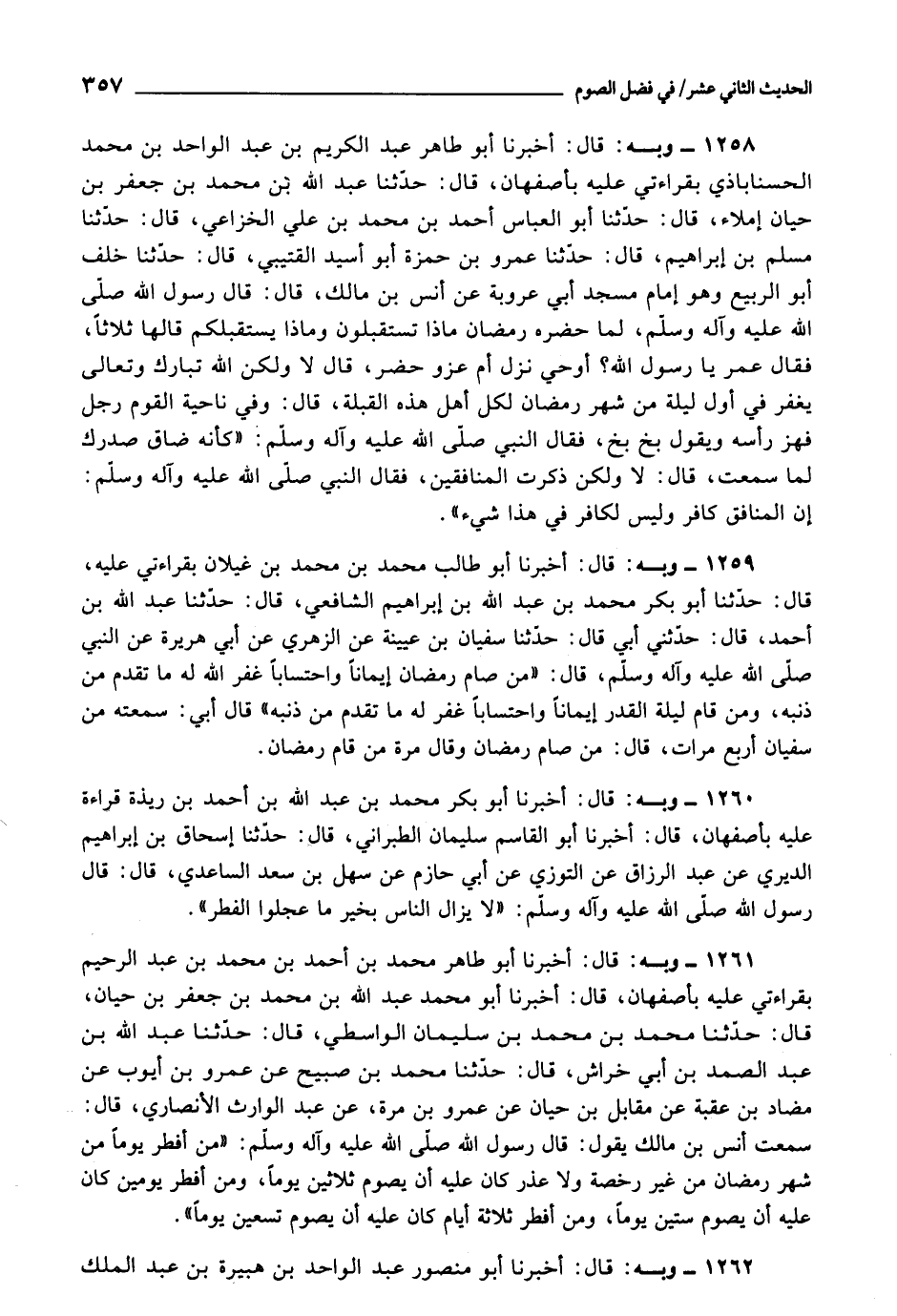 1261 - أَخْبَرَنَا أَبُو طَاهِرِ بْنُ أَحْمَدَ بْنِ مُحَمَّدِ بْنِ عَبْدِ الرَّحِيمِ، بِقِرَاءَتِي عَلَيْهِ بِأَصْفَهَانَ، قَالَ: أَخْبَرَنَا أَبُو مُحَمَّدٍ عَبْدُ اللَّهِ بْنُ مُحَمَّدِ بْنِ جَعْفَرِ بْنِ حَيَّانَ، قَالَ: حَدَّثَنَا مُحَمَّدُ بْنُ مُحَمَّدِ بْنِ سُلَيْمَانَ الْوَاسِطِيُّ، قَالَ: حَدَّثَنَا عَبْدُ اللَّهِ بْنُ عَبْدِ الصَّمَدِ بْنِ أَبِي خِرَاشٍ، قَالَ: حَدَّثَنَا مُحَمَّدُ بْنُ صُبَيْحٍ، عَنْ عَمْرِو بْنِ أَيُّوبَ، عَنْ مَضَادِ بْنِ عُقْبَةَ، عَنْ مُقَابِلِ بْنِ حَيَّانَ، عَنْ عَمْرِو بْنِ مُرَّةَ، عَنْ عَبْدِ الْوَارِثِ الْأَنْصَارِيِّ، قَالَ: سَمِعْتُ أَنَسِ بْنِ مَالِكٍ، يَقُولُ: قَالَ رَسُولُ اللَّهِ صَلَّى اللَّهُ عَلَيْهِ وَآلِهِ وَسَلَّمَ: «مَنْ أَفْطَرَ يَوْمًا مِنْ شَهْرِ رَمَضَانَ مِنْ غَيْرِ رُخْصَةٍ وَلَا عُذْرٍ كَانَ عَلَيْهِ أَنْ يَصُومَ ثَلَاثِينَ يَوْمًا، وَمَنْ أَفْطَرَ يَوْمَيْنِ كَانَ عَلَيْهِ أَنْ يَصُومَ سِتِّينَ يَوْمًا، وَمَنْ أَفْطَرَ ثَلَاثَةَ أَيَّامٍ كَانَ عَلَيْهِ أَنْ يَصُومَ تِسْعِينَ يَوْمًا»