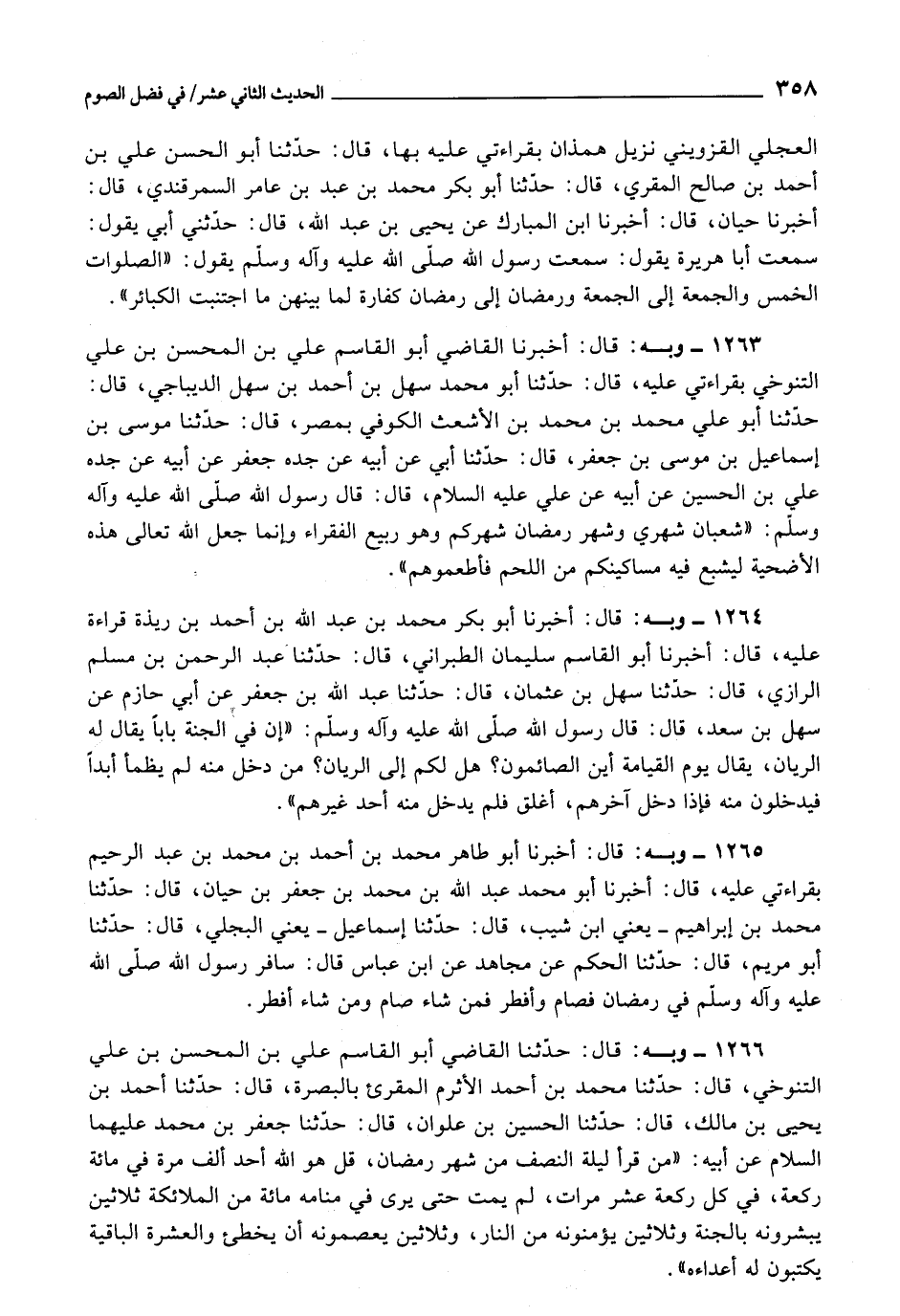 1263 - أَخْبَرَنَا الْقَاضِي أَبُو الْقَاسِمِ عَلِيُّ بْنُ الْمُحَسِّنِ بْنِ عَلِيٍّ التَّنُوخِيُّ، بِقِرَاءَتِي عَلَيْهِ، قَالَ: حَدَّثَنَا أَبُو مُحَمَّدٍ سَهْلُ بْنُ أَحْمَدَ بْنِ سَهْلٍ الدِّيبَاجِيُّ، قَالَ: حَدَّثَنَا أَبُو عَلِيٍّ مُحَمَّدُ بْنُ مُحَمَّدِ بْنِ الْأَشْعَثِ الْكُوفِيُّ، بِمِصْرَ، قَالَ: حَدَّثَنَا مُوسَى بْنُ إِسْمَاعِيلَ بْنِ مُوسَى بْنِ جَعْفَرٍ، قَالَ: حَدَّثَنَا أَبِي، عَنْ أَبِيهِ، عَنْ جَدِّهِ جَعْفَرٍ، عَنْ أَبِيهِ، عَنْ جَدِّهِ عَلِيِّ بْنِ الْحُسَيْنِ، عَنْ أَبِيهِ، عَنْ عَلِيٍّ عَلَيْهِ السَّلَامُ، قَالَ: قَالَ رَسُولُ اللَّهِ صَلَّى اللَّهُ عَلَيْهِ وَآلِهِ وَسَلَّمَ: «شَعْبَانُ شَهْرِي، وَشَهْرُ رَمَضَانَ شَهْرُكُمْ، وَهُوَ رَبِيعُ الْفُقَرَاءِ، وَإِنَّمَا جَعَلَ اللَّهُ تَعَالَى هَذِهِ الْأُضْحِيَةَ لِيَشْبَعَ فِيهَا مَسَاكِينُكُمْ مِنَ اللَّحْمِ فَأَطْعِمُوهُمْ»