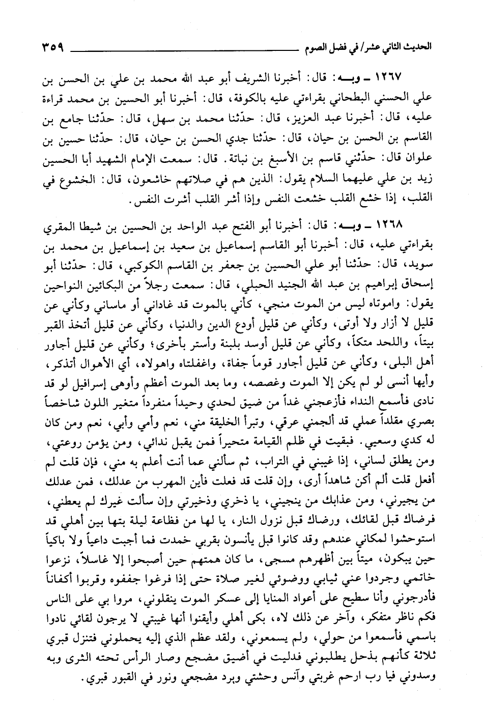 1267 - أَخْبَرَنَا الشَّرِيفُ أَبُو عَبْدِ اللَّهِ مُحَمَّدُ بْنُ عَلِيِّ بْنِ الْحَسَنِ بْنِ عَلِيٍّ الْحَسَنِيُّ الْبَطْحَانِيُّ، بِقِرَاءَتِي عَلَيْهِ بِالْكُوفَةِ، قَالَ: أَخْبَرَنَا أَبُو الْحُسْيَنِ بْنُ مُحَمَّدٍ، قِرَاءَةً عَلَيْهِ، قَالَ: أَخْبَرَنَا عَبْدُ الْعَزِيزِ، قَالَ: حَدَّثَنَا مُحَمَّدُ بْنُ سَهْلٍ، قَالَ: حَدَّثَنَا جَامِعُ بْنُ الْقَاسِمِ بْنِ الْحَسَنِ بْنِ حَيَّانَ، قَالَ: حَدَّثَنَا جَدِّي الْحَسَنُ بْنُ حَيَّانَ، قَالَ: حَدَّثَنَا حُسَيْنُ بْنُ عُلْوَانَ، قَالَ: حَدَّثَنِي قَاسِمُ بْنُ الْأَسْبَغِ بْنِ نَبَاتَةَ، قَالَ: سَمِعْتُ الْإِمَامَ الشَّهِيدَ أَبَا الْحُسَيْنِ زَيْدَ بْنَ عَلِيٍّ، عَلَيْهِمَا السَّلَامُ، يَقُولُ: " {الَّذِينَ هُمْ فِي صَلاتِهِمْ خَاشِعُونَ} [المؤمنون: 2] ، قَالَ: الْخُشُوعُ فِي الْقَلْبِ، إِذَا خَشَعَ الْقَلْبُ خَشَعَتِ النَّفْسُ وَإِذَا أَشَرَّ الْقَلْبُ أَشَرَّتِ النَّفْسُ ".