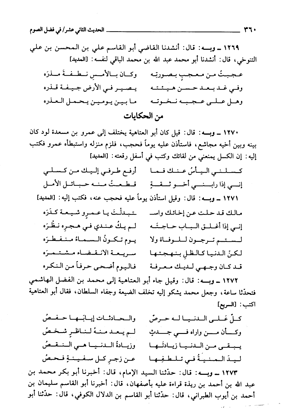 1269 - أَنْشَدَنَا الْقَاضِي أَبُو الْقَاسِمِ عَلِيُّ بْنُ الْمُحَسِّنِ بْنِ عَلِيٍّ التَّنُوخِيُّ، قَالَ: أَنْشَدَنَا أَبُو مُحَمَّدٍ عَبْدُ اللَّهِ بْنُ مُحَمَّدٍ الْبَاقِي لِنَفْسِهِ: