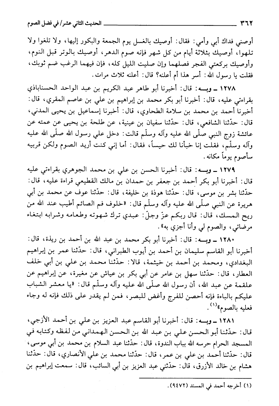 1280 - أَخْبَرَنَا أَبُو بَكْرٍ مُحَمَّدُ بْنُ عَبْدِ اللَّهِ بْنِ أَحْمَدَ بْنِ رَيْذَةَ، قَالَ: أَخْبَرَنَا أَبُو الْقَاسِمِ سُلَيْمَانُ بْنُ أَحْمَدَ بْنِ أَيُّوبَ الطَّبَرَانِيُّ، قَالَ: حَدَّثَنَا عُمَرُ بْنُ إِبْرَاهِيمَ الْبَغْدَادِيُّ، وَمُحَمَّدُ بْنُ أَحْمَدَ بْنِ خَيْثَمَةَ، قَالَا: حَدَّثَنَا مُحَمَّدُ بْنُ عَلِيِّ بْنِ أَبِي خَلَفٍ الْعَطَّارُ، قَالَ: حَدَّثَنَا سَهْلُ بْنُ عَامِرٍ، عَنْ أَبِي بَكْرِ بْنِ عَيَّاشٍ، عَنْ مُغِيرَةَ، عَنْ إِبْرَاهِيمَ، عَنْ عَلْقَمَةَ، عَنْ عَبْدِ اللَّهِ، أَنّ رَسُولَ اللَّهِ صَلَّى اللَّهُ عَلَيْهِ وَآلِهِ وَسَلَّمَ، قَالَ: «يَا مَعْشَرَ الشَّبَابِ، عَلَيْكُمْ بِالْبَاءَةِ فَإِنَّهُ أَحْصَنُ لِلْفَرْجِ، وَأَغَضُّ لِلْبَصَرِ، فَمَنْ لَمْ يَقْدِرْ عَلَى ذَلِكَ فَإِنَّهُ لَهُ وِجَاءٌ فَعَلَيْهِ بِالصَّوْمِ»