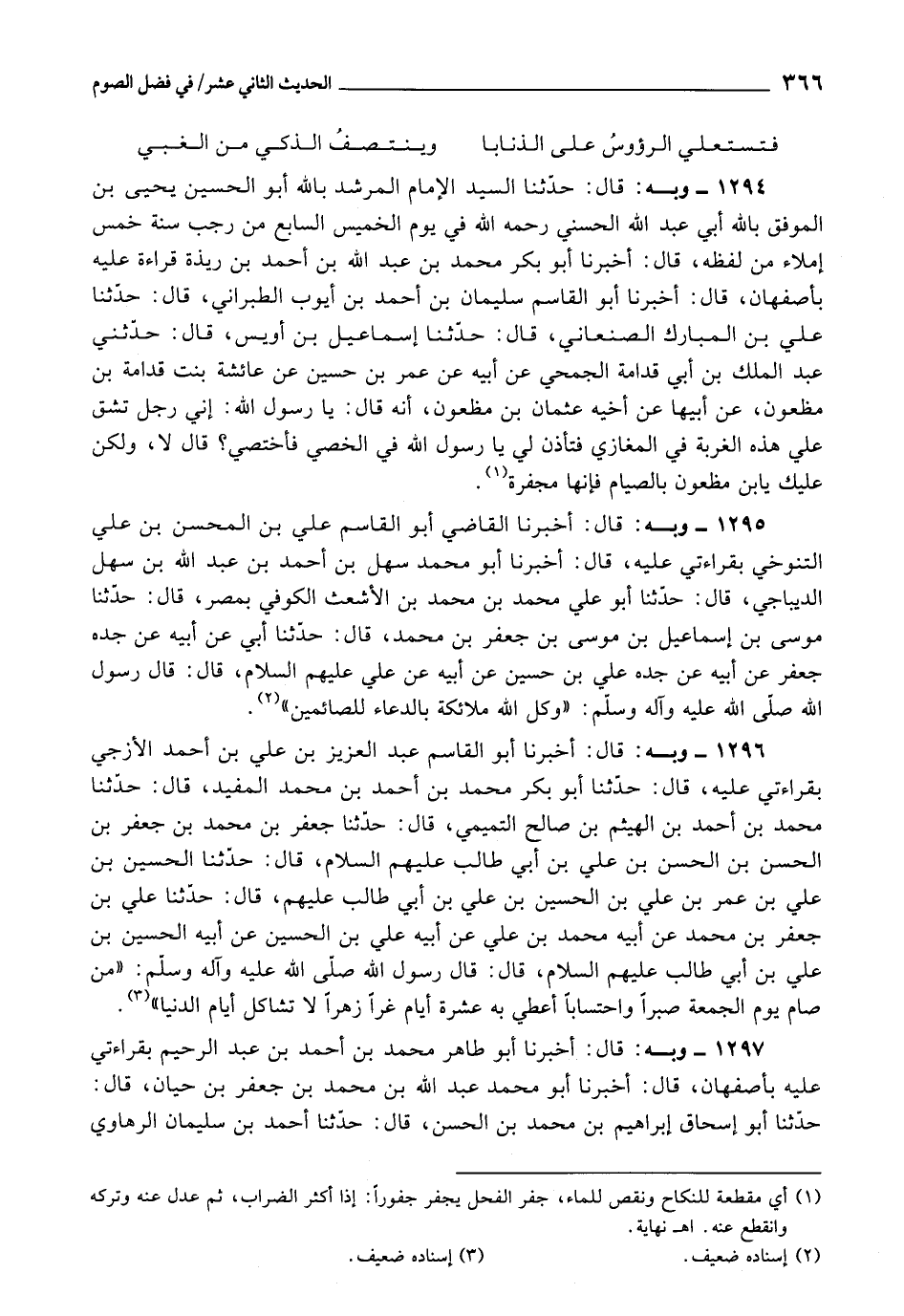 1296 - أَخْبَرَنَا أَبُو الْقَاسِمِ عَبْدُ الْعَزِيزِ بْنُ عَلِيِّ بْنِ أَحْمَدَ الْأَزَجِيُّ، بِقِرَاءَتِي عَلَيْهِ، قَالَ: حَدَّثَنَا أَبُو بَكْرٍ مُحَمَّدُ بْنُ أَحْمَدَ بْنِ مُحَمَّدٍ الْمُفِيدُ، قَالَ: حَدَّثَنَا مُحَمَّدُ بْنُ أَحْمَدَ بْنِ الْهَيْثَمِ بْنِ صَالِحٍ التَّمِيمِيُّ، قَالَ: حَدَّثَنَا جَعْفَرُ بْنُ مُحَمَّدِ بْنِ جَعْفَرِ بْنِ الْحَسَنِ بْنِ الْحَسَنِ بْنِ عَلِيِّ بْنِ أَبِي طَالِبٍ عَلَيْهِمُ السَّلَامُ، قَالَ: حَدَّثَنَا الْحُسَيْنُ بْنُ عَلِيِّ بْنِ عُمَرَ بْنِ عَلِيِّ بْنِ الْحُسَيْنِ بْنِ عَلِيِّ بْنِ أَبِي طَالِبٍ عَلَيْهِمُ السَّلَامُ، قَالَ: حَدَّثَنَا عَلِيُّ بْنُ جَعْفَرِ بْنِ مُحَمَّدٍ، عَنْ أَبِيهِ مُحَمَّدِ بْنِ عَلِيٍّ، عَنْ أَبِيهِ عَلِيِّ بْنِ الْحُسَيْنِ، عَنْ أَبِيهِ الْحُسَيْنِ بْنِ عَلِيِّ بْنِ أَبِي طَالِبٍ عَلَيْهِمُ السَّلَامُ، قَالَ: قَالَ رَسُولُ اللَّهِ صَلَّى اللَّهُ عَلَيْهِ وَآلِهِ وَسَلَّمَ: «مَنْ صَامَ يَوْمَ الْجُمُعَةِ صَبْرًا وَاحْتِسَابًا أُعْطِيَ بِهِ عَشْرَةَ أَيَّامٍ غُرًّا زُهْرًا لَا تُشَاكِلُ أَيَّامَ الدُّنْيَا»