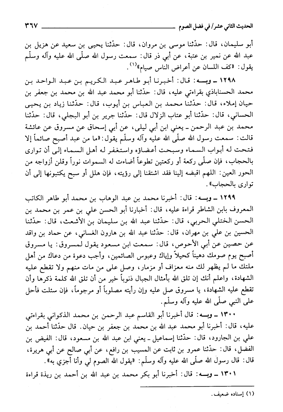 1299 - أَخْبَرَنَا مُحَمَّدُ بْنُ عَبْدِ الْوَهَّابِ بْنِ مُحَمَّدٍ أَبْو طَاهِرٍ الْكَاتِبُ الْمَعْرُوفُ بِابْنِ الشَّاطِرِ، قِرَاءَةً عَلَيْهِ، قَالَ: أَخْبَرَنَا أَبُو الْحَسَنِ عَلِيُّ بْنُ عُمَرَ بْنِ مُحَمَّدِ بْنِ الْحَسَنِ الْخُتُّلِيُّ الْحَرْبِيُّ، قَالَ: حَدَّثَنَا عَبْدُ اللَّهِ بْنُ سُلَيْمَانَ بْنِ الْأَشْعَثِ، قَالَ: حَدَّثَنَا الْحُسَيْنُ بْنُ عَلِيِّ بْنِ مِهْرَانَ، قَالَ: حَدَّثَنَا عَبْدُ اللَّهِ بْنُ هَارُونَ الْغَسَّانِيُّ، عَنْ حَمَّادِ بْنِ وَاقِدٍ، عَنْ حُصَيْنٍ، عَنْ أَبِي الْأَحْوَصِ، قَالَ: سَمِعْتُ ابْنَ مَسْعُودٍ، يَقُولُ لِمَسْرُوقٍ: «يَا مَسْرُوقُ، أَصْبِحْ يَوْمَ صَوْمِكَ دَهِينًا كَحِيلًا وَإِيَّاكَ وَعُبُوسَ الصَّائِمِينَ، وَأَجِبْ دَعْوَةَ مَنْ دَعَاكَ مِنْ أَهْلِ مِلَّتِكَ مَا لَمْ يَظْهَرْ لَكَ مِنْهُ مِعْزَافٌ، أَوْ مِزْمَارٌ، وَصَلِّ عَلَى مَنْ مَاتَ مِنْهُمْ وَلَا تَقْطَعْ عَلَيْهِ الشَّهَادَةَ، وَاعْلَمْ أَنَّكَ إِنْ تَلْقَ اللَّهَ بِأَمْثَالِ الْجِبَالِ ذُنُوبًا خَيْرٌ مِنْ أَنْ تَلْقَ اللَّهَ كَلِمَةً ذَكَرَهَا وَأَنْ تَقْطَعَ عَلَيْهِ الشَّهَادَةَ، يَا مَسْرُوقُ، صَلِّ عَلَيْهِ وَإِنْ رَأَيْتَهُ مَصْلُوبًا، أَوْ مَرْجُومًا، فَإِنْ سُئِلْتَ فَأَحِلْ عَلَى النَّبِيِّ صَلَّى اللَّهُ عَلَيْهِ وَآلِهِ وَسَلَّمَ»