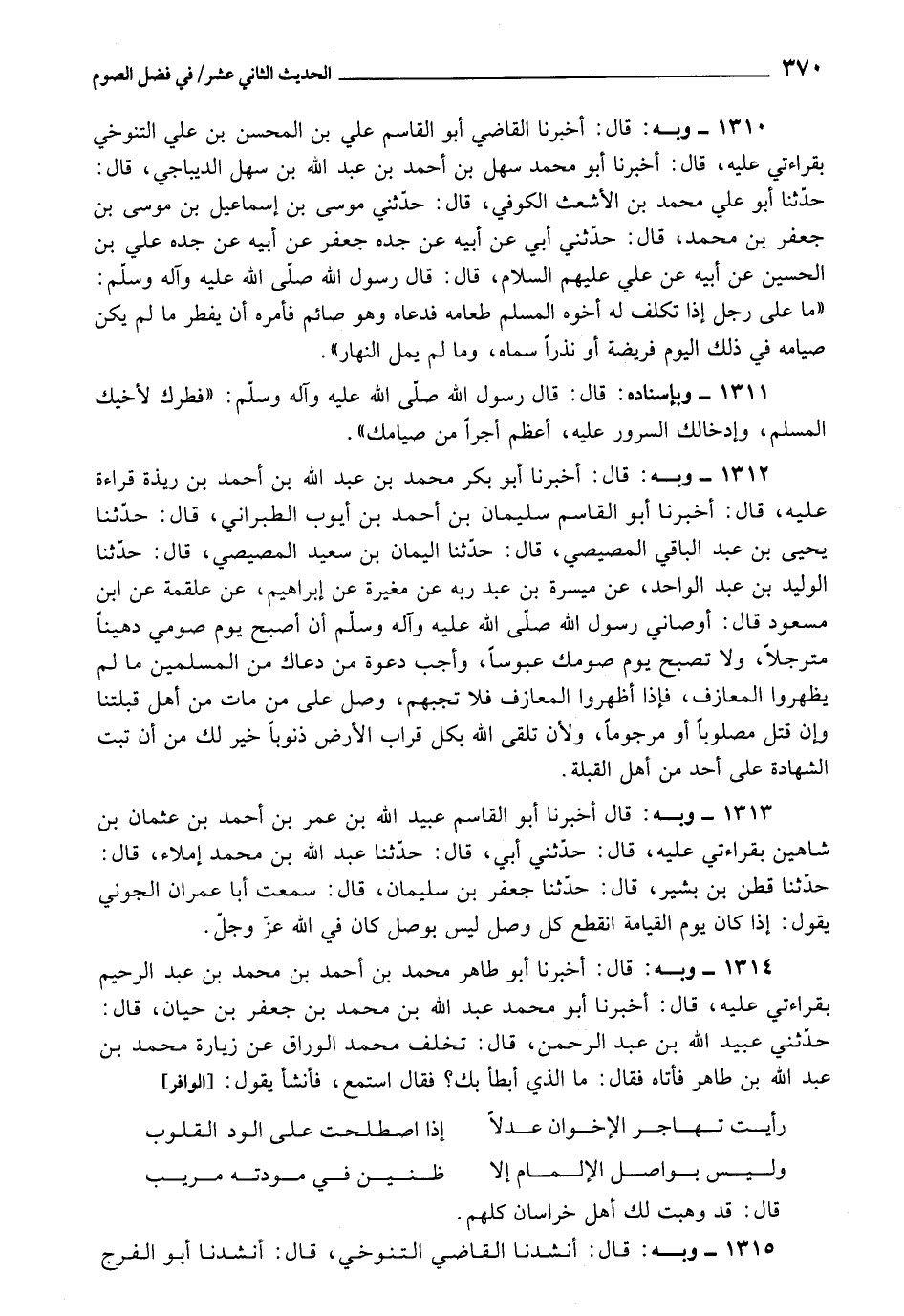 1310 - أَخْبَرَنَا الْقَاضِي أَبُو الْقَاسِمِ عَلِيُّ بْنُ الْمُحَسِّنِ بْنِ عَلِيٍّ التَّنُوخِيُّ، بِقِرَاءَتِي عَلَيْهِ، قَالَ: أَخْبَرَنَا أَبُو مُحَمَّدٍ سَهْلُ بْنُ أَحْمَدَ بْنِ عَبْدِ اللَّهِ بْنِ سَهْلٍ الدِّيبَاجِيُّ، قَالَ: حَدَّثَنَا أَبُو عَلِيٍّ مُحَمَّدُ بْنُ الْأَشْعَثِ الْكُوفِيُّ، قَالَ: حَدَّثَنِي مُوسَى بْنُ إِسْمَاعِيلَ بْنِ مُوسَى بْنِ جَعْفَرِ بْنِ مُحَمَّدٍ، قَالَ: حَدَّثَنِي أَبِي، عَنْ أَبِيهِ، عَنْ جَدِّهِ جَعْفَرٍ، عَنْ أَبِيهِ، عَنْ جَدِّهِ عَلِيِّ بْنِ الْحُسَيْنِ، عَنْ أَبِيهِ، عَنْ عَلِيٍّ عَلَيْهِمُ السَّلَامُ، قَالَ: قَالَ رَسُولُ اللَّهِ صَلَّى اللَّهُ عَلَيْهِ وَآلِهِ وَسَلَّمَ: «مَا عَلَى رَجُلٍ إِذَا تَكَلَّفَ لَهُ أَخُوهُ الْمُسْلِمُ طَعَامَهُ فَدَعَاهُ وَهُوَ صَائِمٌ فَأَمَرَهُ أَنْ يُفْطِرَ مَا لَمْ يَكُنْ صِيَامُهُ فِي ذَلِكَ الْيَوْمِ فَرِيضَةً، أَوْ نَذْرًا سَمَّاهُ، وَمَا لَمْ يَمِلِ النَّهَارُ»