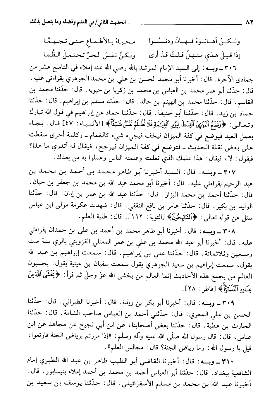 308 - أَخْبَرَنَا أَبُو طَاهِرٍ مُحَمَّدُ بْنُ أَحْمَدَ بْنِ عَلِيِّ بْنِ حَمْدَانَ، بِقِرَاءَتِي عَلَيْهِ، قَالَ: أَخْبَرَنَا أَبُو عَبْدِ اللَّهِ مُحَمَّدُ بْنُ عَلِيِّ بْنِ عُمَرَ الْمُعْتَلِي الْقَزْوِينِيُّ، بِالرَّيِّ سَنَةَ سِتٍّ وَسَبْعِينَ وَثَلاثِ مِائَةٍ، قَالَ: حَدَّثَنَا عَلِيُّ بْنُ إِبْرَاهِيمَ، قَالَ: سَمِعْتُ إِبْرَاهِيمَ بْنَ عَبْدِ اللَّهِ، يَقُولُ: سَمِعْتُ إِبْرَاهِيمَ بْنَ سَعِيدٍ الْجَوْهَرِيَّ، يَقُولُ: سَمِعْتُ سُفْيَانَ بْنَ عُيَيْنَةَ، يَقُولُ: " يَحْسَبُونَ الْعَالِمَ مَنْ يَجْمَعُ هَذِهِ الْأَحَادِيثَ إِنَّمَا الْعَالِمُ مَنْ يَخْشَى اللَّهَ عَزَّ وَجَلَّ ثُمَّ قَرَأَ: {إِنَّمَا يَخْشَى اللَّهَ مِنْ عِبَادِهِ الْعُلَمَاءُ} [فاطر: 28] ".