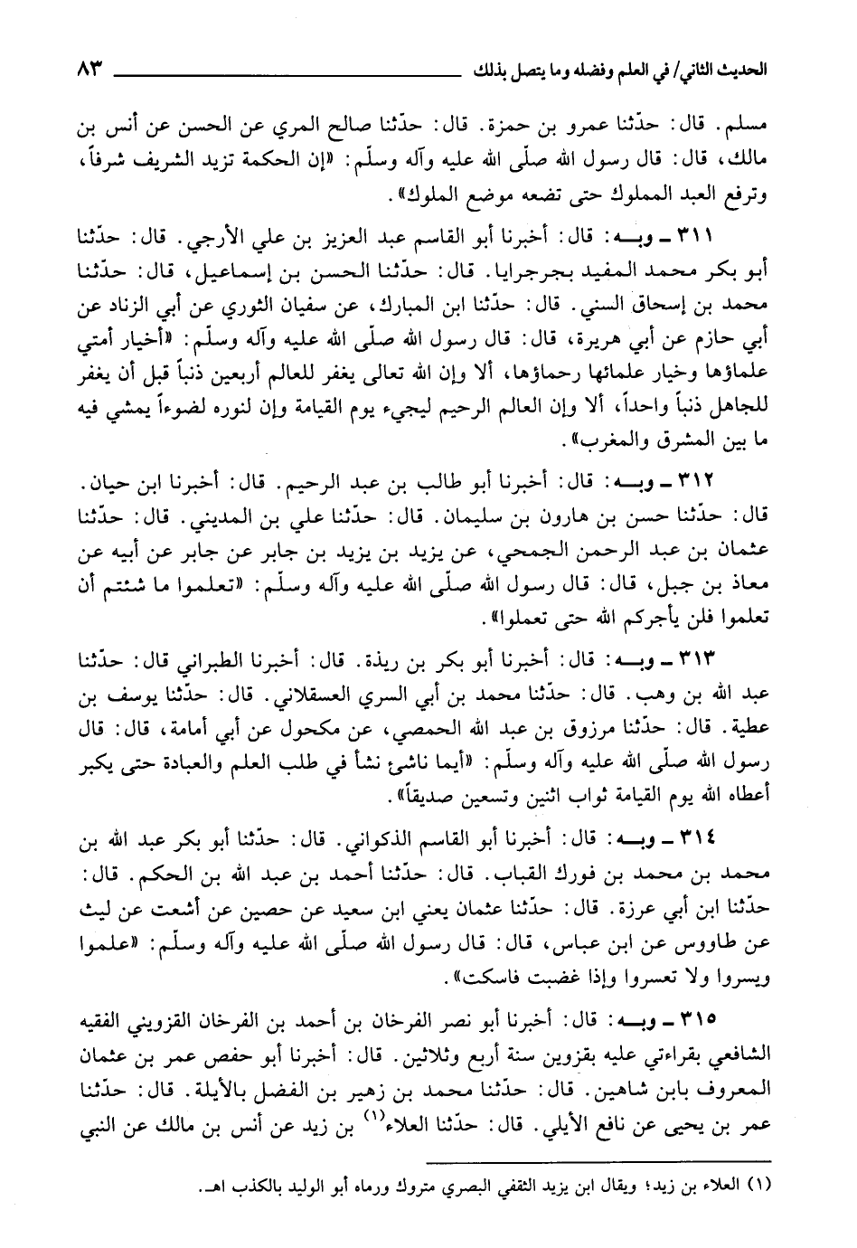 311 - أَخْبَرَنَا أَبُو الْقَاسِمِ عَبْدُ الْعَزِيزِ بْنُ عَلِيٍّ الْأَرْجِيُّ، قَالَ: حَدَّثَنَا أَبُو بَكْرٍ مُحَمَّدٌ الْمُفِيدُ، بِجَرْجَرَايَا، قَالَ: حَدَّثَنَا الْحَسَنُ بْنُ إِسْمَاعِيلَ، قَالَ: حَدَّثَنَا مُحَمَّدُ بْنُ إِسْحَاقَ السُّنِّيُّ، قَالَ: حَدَّثَنَا ابْنُ الْمُبَارَكِ، عَنْ سُفْيَانَ الثَّوْرِيِّ، عَنْ أَبِي الزِّنَادِ، عَنْ أَبِي حَازِمٍ، عَنْ أَبِي هُرَيْرَةَ، قَالَ: قَالَ رَسُولُ اللَّهِ صَلَّى اللَّهُ عَلَيْهِ وَآلِهِ وَسَلَّمَ: «أَخْيَارُ أُمَّتِي عُلَمَاؤُهَا، وَخِيَارُ عُلَمَائِهَا رُحَمَاؤُهَا، أَلَا وَإِنَّ اللَّهَ تَعَالَى يَغْفِرُ لِلْعَالِمِ أَرْبَعِينَ ذَنْبًا قَبْلَ أَنْ يَغْفِرَ لِلْجَاهِلِ ذَنْبًا وَاحِدًا، أَلَا وَإِنَّ الْعَالِمَ الرَّحِيمَ لَيَجِيءُ يَوْمَ الْقِيَامَةِ وَإِنَّ لِنُورِهِ ضَوْءًا، يَمْشِي فِيهِ مَا بَيْنَ الْمَشْرِقِ وَالْمَغْرِبَ»