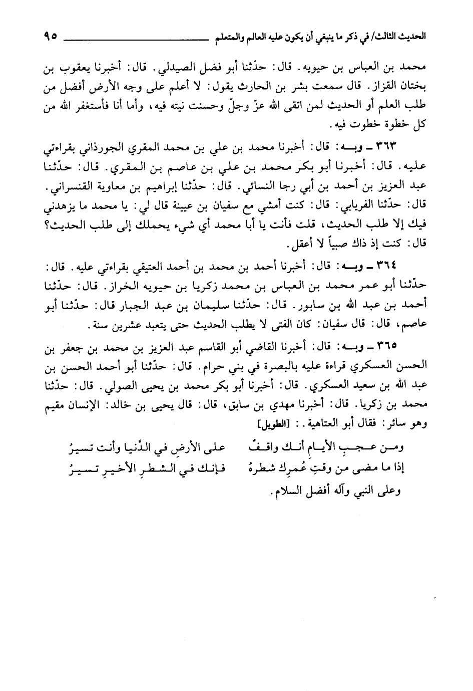 364 - أَخْبَرَنَا أَحْمَدُ بْنُ مُحَمَّدِ بْنِ أَحْمَدَ الْعَتِيقِيُّ، بِقِرَاءَتِي عَلَيْهِ، قَالَ: حَدَّثَنَا أَبُو عُمَرَ مُحَمَّدُ بْنُ الْعَبَّاسِ بْنِ مُحَمَّدٍ زَكَرِيَّا بْنِ حَيُّوَيْهِ الْخَرَّازُ، قَالَ: حَدَّثَنَا أَحْمَدُ بْنُ عَبْدِ اللَّهِ بْنِ سَابُورٍ، قَالَ: حَدَّثَنَا سُلَيْمَانُ بْنُ عَبْدِ الْجَبَّارِ، قَالَ: حَدَّثَنَا أَبُو عَاصِمٍ، قَالَ: قَالَ سُفْيَانُ «كَانَ الْفَتَى لَا يَطْلُبُ الْحَدِيثَ حَتَّى يَتَعَبَّدَ عِشْرِينَ سَنَةً» .
