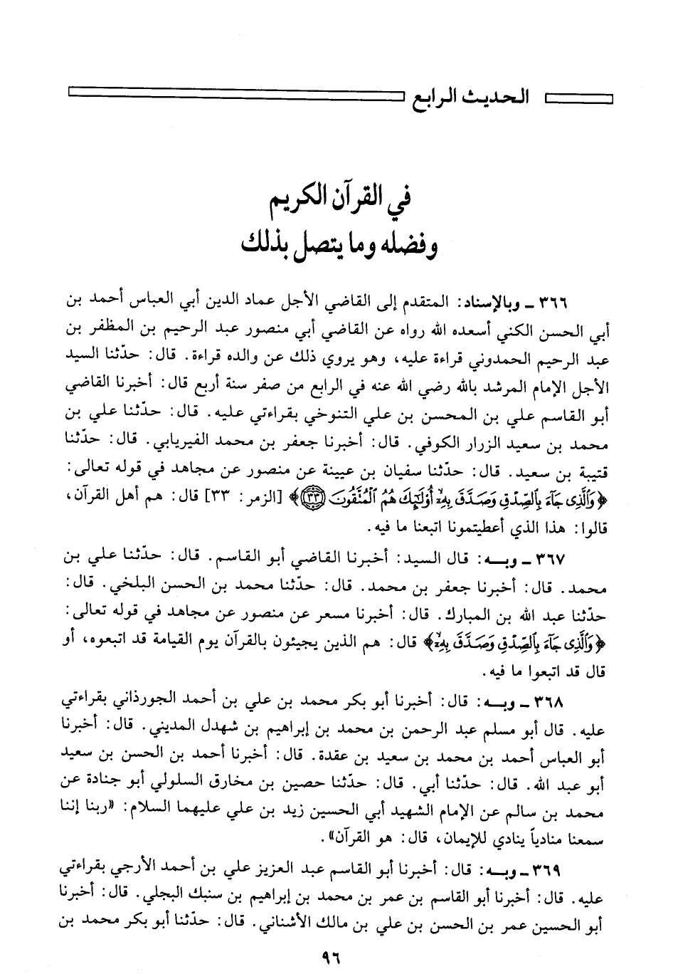 366 - أَخْبَرَنَا الْقَاضِي أَبُو الْقَاسِمِ عَلِيُّ بْنُ الْمُحَسِّنِ بْنِ عَلِيٍّ التَّنُوخِيُّ، بِقِرَاءَتِي عَلَيْهِ، قَالَ: حَدَّثَنَا عَلِيُّ بْنُ مُحَمَّدِ بْنِ سَعِيدٍ الزَّرَّارُ الْكُوفِيُّ، قَالَ: أَخْبَرَنَا جَعْفَرُ بْنُ مُحَمَّدٍ الْفِيرْيَابِيُّ، قَالَ: حَدَّثَنَا قُتَيْبَةُ بْنُ سَعِيدٍ، قَالَ: حَدَّثَنَا سُفْيَانُ بْنُ عُيَيْنَةَ، عَنْ مَنْصُورٍ، عَنْ مُجَاهِدٍ، فِي قَوْلِهِ تَعَالَى " {وَالَّذِي جَاءَ بِالصِّدْقِ وَصَدَّقَ بِهِ أُولَئِكَ هُمُ الْمُتَّقُونَ} [الزمر: 33] قَالَ: هُمْ أَهْلُ الْقُرْآنِ، قَالُوا: هَذَا الَّذِي أَعْطَيْتُمُونَا اتَّبَعْنَا مَا فِيهِ ".