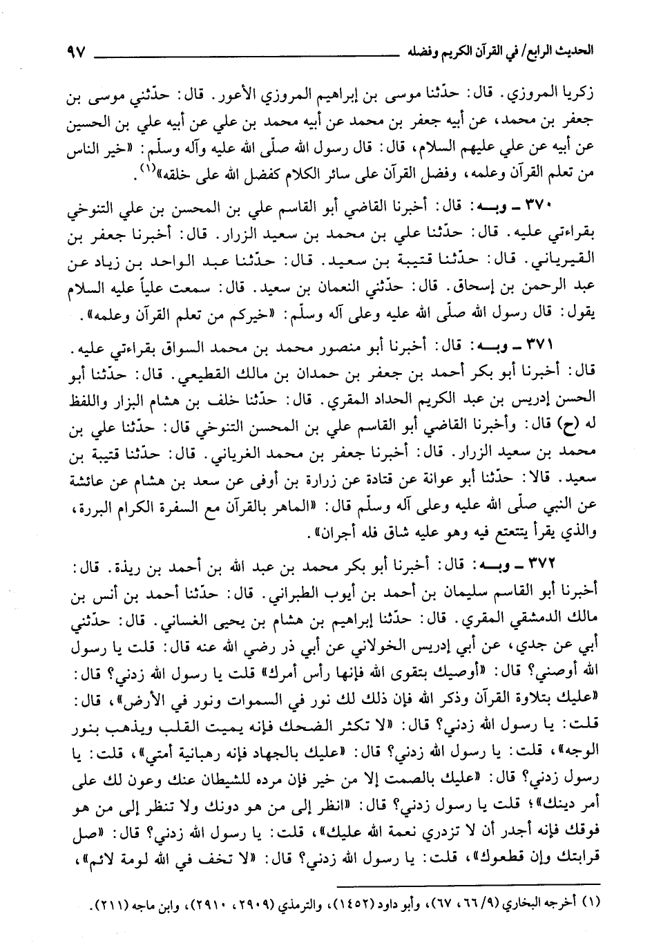 370 - أَخْبَرَنَا الْقَاضِي أَبُو الْقَاسِمِ عَلِيُّ بْنُ الْمُحَسِّنِ بْنِ عَلِيٍّ التَّنُوخِيُّ، بِقِرَاءَتِي عَلَيْهِ، قَالَ: حَدَّثَنَا عَلِيُّ بْنُ مُحَمَّدِ بْنِ سَعِيدٍ الزَّرَّارُ، قَالَ: أَخْبَرَنَا جَعْفَرُ بْنُ الْفِرْيَابِيِّ، قَالَ: حَدَّثَنَا قُتَيْبَةُ بْنُ سَعِيدٍ، قَالَ: حَدَّثَنَا عَبْدُ الْوَاحِدِ بْنُ زِيَادٍ، عَنْ عَبْدِ الرَّحْمَنِ بْنِ إِسْحَاقَ، قَالَ: حَدَّثَنِي النُّعْمَانُ بْنُ سَعِيدٍ، قَالَ: سَمِعْتُ عَلِيًّا عَلَيْهِ السَّلَامُ، يَقُولُ: قَالَ رَسُولُ اللَّهِ صَلَّى اللَّهُ عَلَيْهِ وَآلِهِ وَسَلَّمَ: «خَيْرُكُمْ مَنْ تَعَلَّمَ الْقُرْآنَ وَعَلَّمَهُ»