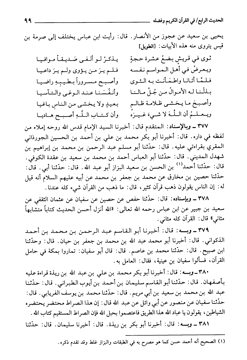 - أَخْبَرَنَا السَّيِّدُ الْإِمَامُ، قَدَّسَ اللَّهُ رُوحَهُ إِمْلَاءً مِنْ لَفْظِهِ فِي دَارِهِ، قَالَ: أَخْبَرَنَا أَبُو بَكْرٍ مُحَمَّدُ بْنُ عَلِيِّ بْنِ أَحْمَدَ بْنِ الْحُسَيْنِ الْجُوزَدَانِيُّ الْمُقْرِيُّ، بِقِرَاءَتِي عَلَيْهِ، قَالَ: حَدَّثَنَا أَبُو مُسْلِمٍ عَبْدُ الرَّحْمَنِ بْنِ مُحَمَّدِ بْنِ إِبْرَاهِيمَ بْنِ شَهْدَلٍ الْمَدِينِيُّ، قَالَ: حَدَّثَنَا أَبُو الْعَبَّاسِ أَحْمَدُ بْنُ مُحَمَّدِ بْنِ سَعِيدِ بْنِ عُقْدَةَ الْكُوفِيُّ، قَالَ: حَدَّثَنَا أَحْمَدُ بْنُ الْحَسَنِ بْنِ سَعِيدٍ الْبَزَّازُ أَبُو عَبْدِ اللَّهِ، قَالَ: حَدَّثَنَا أَبِي، قَالَ: حَدَّثَنَا حُصَيْنُ بْنُ مُخَارِقٍ، عَنْ مُحَمَّدِ بْنِ جَعْفَرِ بْنِ مُحَمَّدٍ، عَنْ أَبِيهِ، عَلَيْهِمُ السَّلَامُ أَنَّهُ قِيلَ لَهُ: إِنَّ النَّاسَ يَقُولُونَ: ذَهَبَ قُرْآنٌ كَثِيرٌ، قَالَ: «مَا ذَهَبَ مِنَ الْقُرْآنِ شَيْءٌ كُلُّهُ عِنْدَنَا» .