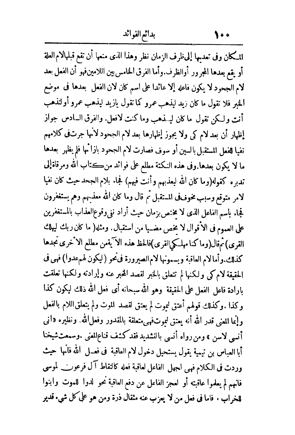 المكان وفي تعديها إلى ظرف الزمان نظر وهذا الذي منعها أن تقع قبلها لام العلة أو يقع بعدها المجرور أو الظرف وأما الفرق الخامس بين اللامين فهو أن الفعل بعد لام الجحود لا يكون فاعله إلا عائدا على اسم كان لأن الفعل بعدها في موضع الخبر فلا تقول ما كان زيد ليذهب عمرو كما تقول يا زيد ليذهب عمرو أو لتذهب أنت ولكن تقول ما كان ليذهب وما كنت لأفعل والفرق السادس جواز إظهار أن بعد لام كي ولا يجوز إظهارها بعد لام الجحود لأنها جرت في كلامهم نفيا للفعل المستقبل بالسين أو سوف فصارت لام الجحود بإزائها فلم يظهر بعدها ما لا يكون بعدها وفي هذه النكتة مطلع على فوائد من كتاب الله ومرقاة إلى تدبره كقوله: {وَمَا كَانَ اللَّهُ لِيُعَذِّبَهُمْ وَأَنْتَ فِيهِمْ} فجاء بلام الجحود حيث كان نفيا لأمر متوقع وسبب مخوف في المستقبل ثم قال: {وَمَا كَانَ اللَّهُ مُعَذِّبَهُمْ وَهُمْ يَسْتَغْفِرُونَ} فجاء باسم الفاعل الذي لا يختص بزمان حيث أراد نفي وقوع العذاب بالمستغفرين على العموم في الأقوال لا يخص مضيا من استقبال ومثله: {وَمَا كَانَ رَبُّكَ لِيُهْلِكَ الْقُرَى} ثم قال: {وَمَا كُنَّا مُهْلِكِي الْقُرَى} فلاحظ هذه الآية من مطلع الأخرى تجدها كذلك لام العاقبة أو لام الصيرورة وأما لام العاقبة ويسمونها لام الصيرورة في نحو: {لِيَكُونَ لَهُمْ عَدُوّاً} فهي في الحقيقة لام كي ولكنها تتعلق بالخبر لقصد المخبر عنه وإرادته ولكنها تعلقت بإرادة فاعل الفعل على الحقيقة وهو الله سبحانه وتعالى أي فعل الله تعالى ذلك ليكون كذا وكذا وكذلك قولهم أعتق ليموت لم يعتق لقصد الموت ولم تتعلق اللام بالفعل وإنما المعنى قدر الله أنه يعتق ليموت فهي متعلقة بالمقدور وفعل الله ونظيره إني: "أنسى لا سن" ومن رواه أنسي بالتشديد فقد كشف قناع المعنى وسمعت شيخنا أبا العباس بن تيمية يقول: يستحيل دخول لام العاقبة في فعل الله فإنها حيث وردت في الكلام فهي لجهل الفاعل لعاقبة فعله كالتقاط آل فرعون لموسى فإنهم لم يعلموا عاقبته أو لعجز الفاعل عن دفع العاقبة نحو لدوا للموت وابنوا للخراب فأما في فعل من لا يعزب عنه مثقال ذرة ومن هو على كل شيء قدير