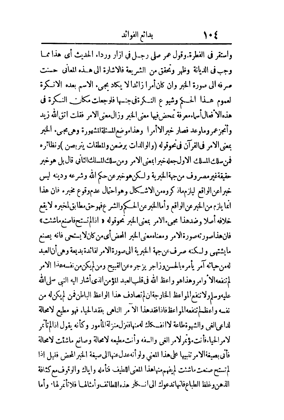 واستقر في الفطرة وقول عمر: "صلى رجل في إزار ورداء" الحديث رواه البخاري أي هذا مما وجب في الديانة وظهر وتحقق من الشريعة فالإشارة إلى هذه المعاني حسنت صرفه إلى صورة الخبر وإن كان أمرا زائدا لا يكاد يجيء الاسم بعده إلا نكرة لعموم هذا الحكم وشيوع النكرة في جنسها فلو جعلت مكان النكرة في هذه الأفعال أسماء معرفة تمخض فيها معنى الخبر وزال معنى الأمر فقلت اتقى الله زيد وأنجز عمر وما وعد فصار خبرا لا أمرا وهذا هو موضع المسألة المشهورة: "وهي مجيء الخبر بمعنى الأمر" مجيء الخبر بمعنى الأمر في القرآن في نحو قوله: {وَالْوَالِدَاتُ يُرْضِعْنَ وَالْمُطَلَّقَاتُ يَتَرَبَّصْنَ} ونظائره فمن سلك المسلك الأول جعله خبرا بمعنى الأمر ومن سلك المسلك الثاني قال بل هو خبر حقيقة غير مصروف من جهة الخبرية ولكن هو خبر عن حكم الله وشرعه ودينه ليس خبرا عن الواقع ليلزم ما ذكروه من الإشكال وهو احتمال عدم وقوع مخبره فإن هذا إنما يلزم من الخبر عن الواقع وأما الخبر عن الحكم والشرع فهو حق مطابق لمخبره لا يقع خلافه أصلا وضد هذا مجيء الأمر بمعنى الخبر نحو قوله: " إذا لم تستح فاصنع ما شئت " رواه البخاري وأبو داود وابن ماجة فإن هذا صورته صورة الأمر ومعناه معنى الخبر المحض أي من كان لا يستحيي فإنه يصنع ما يشتهي ولكنه صرف عن جهة الخبرية إلى صورة الأمر لفائدة بديعة وهي أن العبد له من حيائه آمر يأمره بالحسن وزاجر يزجره عن القبيح ومن لم يكن من نفسه هذا الأمر لم تنفعه الأوامر وهذا هو واعظ الله في قلب العبد المؤمن الذي أشار إليه النبي صلى الله عليه وسلم ولا تنفع المواعظ الخارجة إن لم تصادف هذا الواعظ الباطن فمن لم يكن له من نفسه واعظ لم تنفعه المواعظ فإذا فقد هذا الأمر الناهي بفقد الحياء فهو مطيع لا محالة لداعي الغي والشهوة طاعة لا انفكاك له منها فنزل منزلة المأمور وكأنه يقول إذا لم تأتمر لأمر الحياء فأنت مؤتمر لأمر الغي والسفه وأنت مطيعه لا محالة وصانع ما شئت لا محالة فأتى بصيغة الأمر تنبيها على هذا المعنى ولو أنه عدل عنها إلى صيغة الخبر المحض فقيل: إذا لم تستح صنعت ما شئت لم يفهم منها هذا المعنى اللطيف فتأمله وإياك والوقوف مع كثافة الذهن وغلظ الطباع فإنها تدعوك إلى إنكار هذه اللطائف وأمثالها فلا تأتمر لها وأما