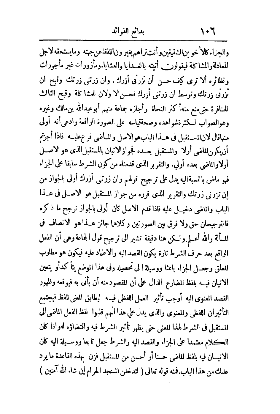 والجزاء كالأخوين الشقيقين وأنت تراهم يغيرون اللفظ عن جهته وما يستحقه لأجل المعادلة والمشاكلة فيقولون أتيته بالغدايا والعشايا ومأزورات غير مأجورات ونظائره ألا ترى كيف حسن إن تزرني أزرك وإن زرتني زرتك وقبح إن تزرني زرتك وتوسط إن زرتني أزرك فحسن الأولان للمشاكلة وقبح الثالث للمنافرة حتى منع منه أكثر النحاة وأجاز جماعة منهم أبو عبد الله بن مالك وغيره وهو الصواب لكثرة شواهده وصحة قياسه على الصورة الواقعة وادعى أنه أولى منها قال لأن المستقبل في هذا الباب هو الأصل والماضي فرع عليه فإذا أجزتم أن يكون الماضي أولا والمستقبل بعده فجواز الإتيان بالمستقبل الذي هو الأصل أولا والماضي بعده أولى والتقرير الذي قدمناه من كون الشرط سابقا على الجزاء فهو ماض بالنسبة إليه يدل على ترجيح قولهم وإن زرتني أزرك أولى بالجواز من إن تزرني زرتك والتقرير الذي قرره من جواز المستقبل هو الأصل في هذا الباب والماضي دخيل عليه فإذا قدم الأصل كان أولى بالجواز ترجح ما ذكره فالترجيحان حق ولا فرق بين الصورتين وكلاهما جائز هذا هو الإنصاف في المسألة والله أعلم ولكن هنا دقيقة تشير إلى ترجيح قول الجماعة وهي أن الفعل الواقع بعد حرف الشرط تارة يكون القصد إليه والاعتماد عليه فيكون هو مطلوب المعلق وجعل الجزاء باعثا ووسيلة إلى تحصيله وفي هذا الموضع يتأكد أو يتعين الإتيان فيه بلفظ المضارع الدال على أن المقصود منه أن يأتي به فيوقعه وظهور القصد المعنوي إليه أوجب تأثير العمل اللفظي فيه ليطابق المعنى اللفظ فيجتمع التأثيران اللفظي والمعنوي والذي يدل على هذا أنهم قلبوا لفظ الفعل الماضي إلى المستقبل في الشرط لهذا المعنى حتى يظهر تأثير الشرط فيه واقتضاؤه له وإذا كان الكلام معتمدا على الجزاء والقصد إليه والشرط جعل تابعا ووسيلة إليه كان الإتيان فيه بلفظ: الماضي حسنا أو أحسن من المستقبل فزن بهذه القاعدة ما يرد عليك من هذا الباب فمنه قوله تعالى: {لَتَدْخُلُنَّ الْمَسْجِدَ الْحَرَامَ إِنْ شَاءَ اللَّهُ آمِنِينَ}