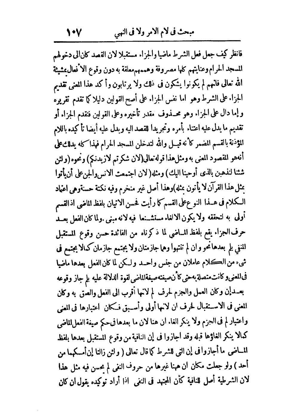 فانظر كيف جعل فعل الشرط ماضيا والجزاء مستقبلا لأن القصد كان إلى دخولهم المسجد الحرام وعنايتهم كلها مصروفة وهممهم معلقة به دون وقوع الأفعال بمشيئة الله تعالى فإنهم لم يكونوا يشكون في ذلك ولا يرتابون وأكد هذا المعنى تقديم الجزاء على الشرط وهو إما نفس الجزاء على أصح القولين دليلا كما تقدم تقريره وإما دال على الجزاء وهو محذوف مقدر تأخيره وعلى القولين فتقدم الجزاء أو تقديم ما يدل عليه اعتناء بأمره وتجريدا للقصد إليه ويدل عليه أيضا تأكيده باللام المؤذنة بالقسم المضمر كأنه قيل والله لتدخلن المسجد الحرام فهذا كله يدلك على أنه هو المقصود المعنى به ومثل هذا قوله تعال: {لَئِنْ شَكَرْتُمْ لأَزِيدَنَّكُمْ} ونحوه: {وَلَئِنْ شِئْنَا لَنَذْهَبَنَّ بِالَّذِي أَوْحَيْنَا إِلَيْكَ} ومثله: {لَئِنِ اجْتَمَعَتِ الأِنْسُ وَالْجِنُّ عَلَى أَنْ يَأْتُوا بِمِثْلِ هَذَا الْقُرْآنِ لا يَأْتُونَ بِمِثْلِهِ} وهذا أصل غير منخرم وفيه نكتة حسنة وهي اعتماد الكلام في هذا النوع على القسم كما رأيت فحسن الإتيان بلفظ الماضي إذ القسم أولى به لتحققه ولا يكون الإلغاء مستشنعا فيه لأنه مبني ولما كان الفعل بعد حرف الجزاء يقع بلفظ الماضي لما ذكرناه من الفائدة حسن وقوع المستقبل المنفي بلم بعدها نحو: وإن لم تنتهوا وهما جازمتان ولا يجتمع جازمان كما لا يجتمع في شيء من الكلام عاملان من جنس واحد ولكن لما كان الفعل بعدها ماضيا في المعنى وكانت متصلة به حتى كأن صيغته صيغة الماضي لقوة الدلالة عليه بلم جاز وقوعه بعد إن وكان العمل والجزم لحرف لم لأنها أقرب إلى الفعل وألصق به وكان المعنى في الاستقبال لحرف أن لأنها أولى وأسبق فكان اعتبارها في المعنى واعتبار لم في الجزم ولا ينكر إلغاء أن هنا لأن ما بعدها في حكم صيغة الفعل الماضي كما لا ينكر إلغاؤها قبله وقد أجازوا في إن النافية من وقوع المستقبل بعدها بلفظ الماضي ما أجازوا في إن التي للشرط كما قال تعالى: {وَلَئِنْ زَالَتَا إِنْ أَمْسَكَهُمَا مِنْ أَحَدٍ} ولو جعلت مكان إن هاهنا غيرها من حروف النفي لم يحسن فيه مثل هذا لأن الشرطية أصل للنافية كأن المجتهد في النفي إذا أراد توكيده يقول إن كان