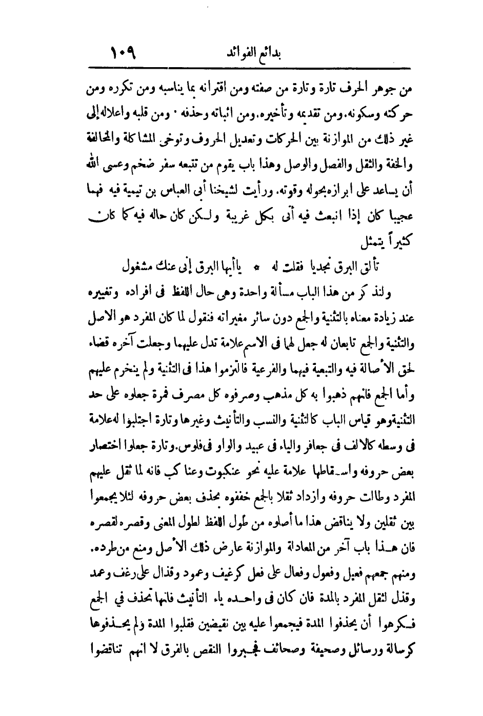 من جوهر الحرف تارة وتارة من صفته ومن اقترانه بما يناسبه ومن تكرره ومن حركته وسكونه ومن تقديمه وتأخره ومن إثباته وحذفه ومن قلبه وإعلاله إلى غير ذلك من الموازنة بين الحركات وتعديل الحروف وتوخي المشاكلة والمخالفة والخفة والثقل والفصل والوصل وهذا باب يقوم من تتبعه سفر ضخم وعسى الله أن يساعد على إبرازه بحوله وقوته ورأيت لشيخنا أبي العباس بن تيمية فيه فهما عجيبا كان إذا انبعث فيه أتى بكل غريبة ولكن كان حاله فيه كما كان كثيرا يتمثل:
