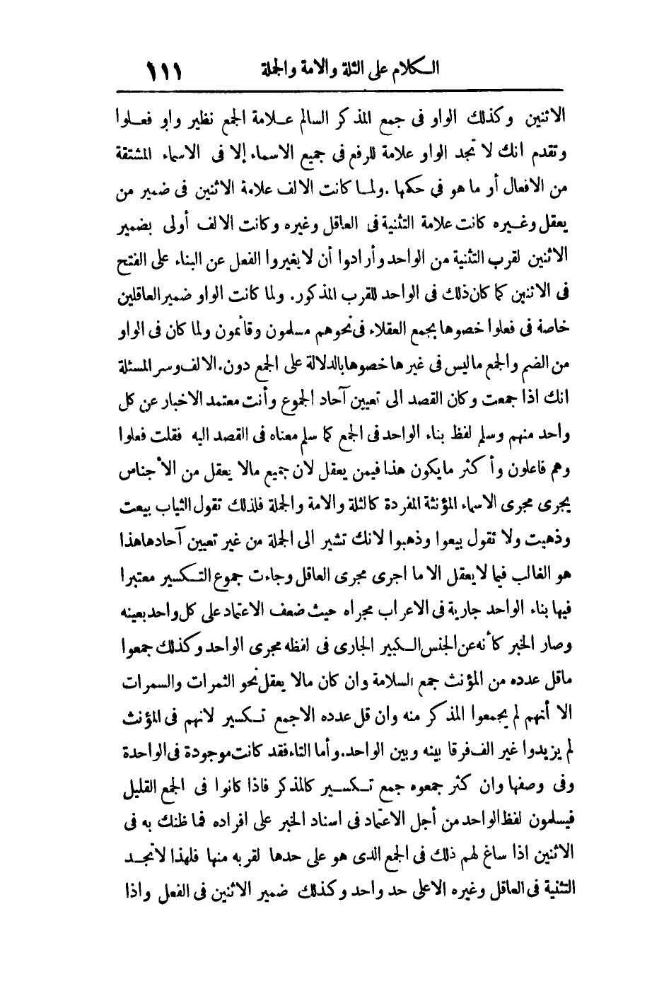 الإثنين وكذلك الواو في جمع المذكر السالم علامة الجمع نظير واو فعلوا وتقدم أنك لا تجد الواو علامة للرفع في جميع الأسماء إلا في الأسماء المشتقة من الأفعال أو ما هو في حكمها ولما كانت الألف علامة الإثنين في ضمير من يعقل وغيره كانت علامة التثنية في العاقل وغيره وكانت الألف أولى بضمير الإثنين لقرب التثنية من الواحد وأرادوا أن لا يغيروا الفعل عن البناء على الفتح في الإثنين كما كان ذلك في الواحد للقرب المذكور ولما كانت الواو ضمير العاقلين خاصة في فعلوا خصوها بجمع العقلاء في نحو هم مسلمون وقائمون ولما كان في الواو من الضم والجمع ما ليس في غيرها خصوها بالدلالة على الجمع دون الألف وسر المسألة أنك إذا جمعت وكان القصد إلى تعيين آحاد الجموع وأنت معتمد الإخبار عن كل واحد منهم وسلم لفظ بناء الواحد في الجمع كما سلم معناه في القصد إليه فقلت: فعلوا وهم فاعلون وأكثر ما يكون هذا فيمن يعقل لأن جميع ما لا يعقل من الأجناس يجري مجرى الأسماء المؤنثة المفردة كالثلة والأمة والجملة فلذلك تقول الثياب بيعت وذهبت ولا تقول بيعوا وذهبوا لأنك تشير إلى الجملة من غير تعيين آحادها هذا هو الغالب فيما لا يعقل إلا ما أجرى مجرى العاقل وجاءت جموع التكسير معتبرا فيها بناء الواحد جارية في الإعراب مجراه حيث ضعف الإعتماد على كل واحد بعينه وصار الخبر كأنه عن الجنس الكبير الجاري في لفظه مجرى الواحد وكذلك جمعوا ما قل عدده من المؤنث جمع السلامة وإن كان ما لا يعقل نحو الثمرات والسمرات إلا أنهم لم يجعلوا المذكر منه وإن قل عدده إلا جمع تكسير لأنهم في المؤنث لم يزيدوا غير ألف فرقا بينه وبين الواحد وأما التاء فقد كانت موجودة في الواحدة وفي وصفها وإن كثر جمعوه جمع تكسير كالمذكر فإذا كانوا في الجمع القليل يسلمون لفظ الواحد من أجل الإعتماد في إسناد الخبر على إفراده فما ظنك به في الإثنين إذا ساغ لهم ذلك في الجمع الذي هو على حدها لقربه منها فلهذا لا تجد التثنية في العاقل وغيره إلا على حد واحد وكذلك ضمير الإثنين في الفعل تثنية الأسماء