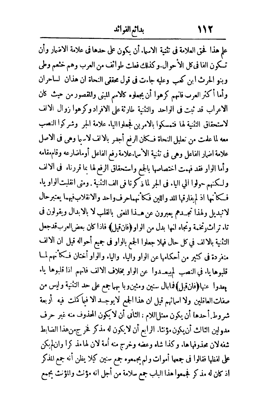 إذا علم هذا فحق العلامة في تثنية الأسماء أن يكون على حدها في علامة الإضمار وأن تكون ألفا في كل الأحوال وكذلك فعلت طوائف من العرب وهم خثعم وطيء وبنو الحرث بن كعب وعليه جاءت في قول محققي النحاة: {إِنْ هَذَانِ لَسَاحِرَانِ} وأما أكثر العرب فإنهم كرهوا أن يجعلوه كالاسم المبني والمقصور من حيث كان الإعراب قد ثبت في الواحد والتثنية طارئة على الإفراد وكرهوا زوال الألف لاستحقاق التثنية لها فتمسكوا بالأمرين فجعلوا الياء علامة الجر وشركوا النصب معه لما علمت من تعليل النحاة فكان الرفع أجدر بالألف لا سيما وهي في الأصل علامة إضمار الفاعل وهي في تثنية الأسماء علامة رفع الفاعل أو ما ضارعه وقام مقامه وأما الواو فقد فهمت اختصاصها بالجمع واستحقاق الرفع لها بما قررناه في الألف ولكنهم حولوا إلى الياء في الجر لما ذكرنا في ألف التثنية ومتى انقلبت الواو ياء فكأنها إذ لم يفارقها المد واللين فكأنهما حرف واحد والانقلاب فيهما يعتبر حالا لا تبديلا ولهذا تجدهم يعبرون عن هذا المعنى بالقلب لا بالإبدال ويقولون في تاء تراث وتخمة وتجاه أنها بدل من الواو فإن قيل: فإذا كان بعض العرب قد جعل التثنية بالألف في كل حال فهلا جعلوا الجمع بالواو في جميع أحواله قيل: إن الألف منفردة في كثير من أحكامها عن الواو والياء والواو أختان فكأنهم لما قلبوها ياء في النصب لم يبعدوا عن الواو بخلاف الألف فإنهم إذا قلبوها ياء بعدوا عنها جمع سنين ومئين فإن قيل: فما بال جمعهما جاء على حد التثنية وليس على صفات العاقلين ولا أسمائهم قيل: إن هذا الجمع لا يوجد إلا فيما كملت فيه أربعة شروط أحدها أن يكون معتل اللام الثاني أن لا يكون المحذوف منه غير حرف مد ولين الثالث أن يكون مؤنثا الرابع أن لا يكون له مذكر فخرج من هذا الضابط شفه لأن محذوفها هاء وكذا شاه وعضه وخرج منه أمه لأن لها مذكرا وإن لم يكن على لفظها فقالوا: في جمعها أموات ولم يجمعوه جمع سنين كيلا يظن أنه جمع المذكر إذ كان له مذكر فجمعوا هذا الباب جمع سلامة من أجل أنه مؤنث والمؤنث يجمع