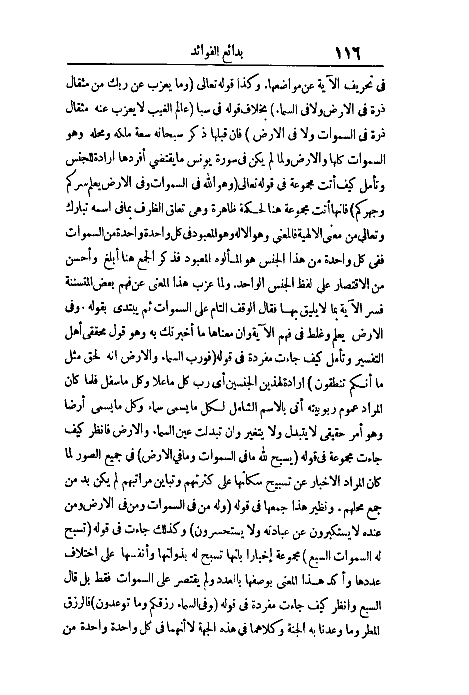 في تحريف الآية عن مواضعها إفراد السماء وجمعها وكذا قال الله تعالى: {وَمَا يَعْزُبُ عَنْ رَبِّكَ مِنْ مِثْقَالِ ذَرَّةٍ فِي الأرْضِ وَلا فِي السَّمَاءِ} بخلاف قوله في سبأ: {عَالِمِ الْغَيْبِ لا يَعْزُبُ عَنْهُ مِثْقَالُ ذَرَّةٍ فِي السَّمَاوَاتِ وَلا فِي الأَرْضِ} فإن قبلها ذكر سبحانه سعة ملكه ومحله وهو السماوات كلها والأرض ولما لم يكن في سورة يونس ما يقتضي ذلك أفردها إرادة للجنس وتأمل كيف أتت مجموعة في قوله تعالى: {وَهُوَ اللَّهُ فِي السَّمَاوَاتِ وَفِي الأَرْضِ يَعْلَمُ سِرَّكُمْ وَجَهْرَكُمْ} فإنها أتت مجموعة هنا لحكمة ظاهرة وهي تعلق الظرف بما في اسمه تبارك وتعالى من معنى الإلهية فالمعنى وهو الإله وهو المعبود في كل واحدة من السماوات ففي كل واحدة من هذا الجنس هو المألوه المعبود فذكر الجمع هنا أبلغ وأحسن من الإقتصار على لفظ الجنس الواحد ولما عزب هذا المعنى عن فهم بعض المتسننة فسر الآية بما لا يليق بها فقال الوقف التام على السماوات ثم يبتديء بقوله وفي الأرض يعلم وغلط في فهم الآية وأن معناها ما أخبرتك به وهو قول محققي أهل التفسير وتأمل كيف جاءت مفردة في قوله: {فَوَرَبِّ السَّمَاءِ وَالأرْضِ إِنَّهُ لَحَقٌّ مِثْلَ مَا أَنَّكُمْ تَنْطِقُونَ} إرادة لهذين الجنسين أي رب كل ما علا وكل ما سفل فلما كان المراد عموم ربوبيته أتى بالاسم الشامل لكل ما يسمى سماء وكل ما يسمى أرضا وهو أمر حقيقي لا يتبدل ولا يتغير وإن تبدلت عين السماء والأرض فانظر كيف جاءت مجموعة في قوله: {يُسَبِّحُ لِلَّهِ مَا فِي السَّمَاوَاتِ وَمَا فِي الأَرْضِ} في جميع الصور لما كان المراد الإخبار عن تسبيح سكانها على كثرتهم وتباين مراتبهم لم يكن بد من جمع محلهم ونظير هذا جمعها في قوله: {وَلَهُ مَنْ فِي السَّمَاوَاتِ وَالأَرْضِ وَمَنْ عِنْدَهُ لا يَسْتَكْبِرُونَ عَنْ عِبَادَتِهِ وَلا يَسْتَحْسِرُونَ} وكذلك جاءت في قوله: {تُسَبِّحُ لَهُ السَّمَاوَاتُ السَّبْعُ} مجموعة إخبارا بأنها تسبح له بذواتها وأنفسها على اختلاف عددها وأكد هذا المعنى بوصفها بالعدد ولم يقتصر على السماوات فقط بل قال: {السَّبْعُ} وانظر كيف جاءت مفردة في قوله: {وَفِي السَّمَاءِ رِزْقُكُمْ وَمَا تُوعَدُونَ} فالرزق المطر وما وعدنا به الجنة وكلاهما في هذه الجهة لا أنهما في كل واحدة واحدة من