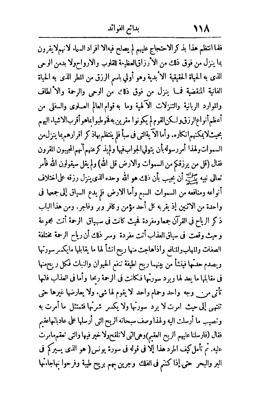 فلما انتظم هذا بذكر الاحتجاج عليهم لم يصلح فيه إلا إفراد السماء لأنهم لا يقرون بما ينزل من فوق ذلك من الأرزاق العظيمة للقلوب والأرواح ولا بد من الوحي الذي به الحياة الحقيقية الأبدية وهو أولى باسم الرزق من المطر الذي به الحياة الفانية المنقضية فما ينزل من فوق ذلك من الوحي والرحمة والألطاف والموارد الربانية والتنزلات الإلهية وما به قوام العالم العلوي والسفلي من أعظم أنواع الرزق ولكن القوم لم يكونوا مقرين به فخوطبوا بما هو أقرب الأشياء إليهم بحيث لا يمكنهم إنكاره وأما الآية التي في سورة سبأ فلم ينتظم بها ذكر إقرارهم بما ينزل من السماوات ولهذا أمر رسوله بأن يتولى الجواب فيها ولم يذكر عنهم أنهم المجيبون المقرون فقال: {قُلْ مَنْ يَرْزُقُكُمْ مِنَ السَّمَاوَاتِ وَالأَرْضِ قُلِ اللَّهُ} ولم يقل: سيقولون الله فأمر تعالى نبيه صلى الله عليه وسلم أن يجيب بأن ذلك هو الله وحده الذي ينزل رزقه على اختلاف أنواعه ومنافعه من السماوات السبع وأما الأرض فلم يدع السياق إلى جمعها في واحدة من الإثنين إذ يقر به كل أحد مؤمن وكافر وبر وفاجر إفراد الرياح وجمعها ومن هذا الباب ذكر الرياح في القرآن جمعا ومفردة فحيث كانت في سياق الرحمة أتت مجموعة وحيث وقعت في سياق العذاب أتت مفردة وسر ذلك أن رياح الرحمة مختلفة الصفات والمهاب والمنافع وإذا هاجت منها ريح أنشأ لها ما يقابلها ما يكسر سورتها ويصدم حدتها فينشأ من بينهما ريح لطيفة تنفع الحيوان والنبات فكل ريح منها في مقابلها ما يعدلها ويرد سورتها فكانت في الرحمة ريحا وأما في العذاب فإنها تأتي من وجه واحد وحمام واحد لا يقوم لها شيء ولا يعارضها غيرها حتى تنتهي إلى حيث أمرت لا يرد سورتها ولا يكسر شرتها فتمتثل ما أمرت به وتصيب ما أرسلت إليه ولهذا وصف سبحانه الريح التي أرسلها على عاد بأنها عقيم فقال: {أرْسَلْنَا عَلَيْهِمُ الرِّيحَ الْعَقِيمَ} وهي التي لا تلقح ولا خير فيها والتي تعقم ما مرت عليه ثم تأمل كيف اطرد هذا إلا في قوله في سورة يونس: {هُوَ الَّذِي يُسَيِّرُكُمْ فِي الْبَرِّ وَالْبَحْرِ حَتَّى إِذَا كُنْتُمْ فِي الْفُلْكِ وَجَرَيْنَ بِهِمْ بِرِيحٍ طَيِّبَةٍ وَفَرِحُوا بِهَا جَاءَتْهَا