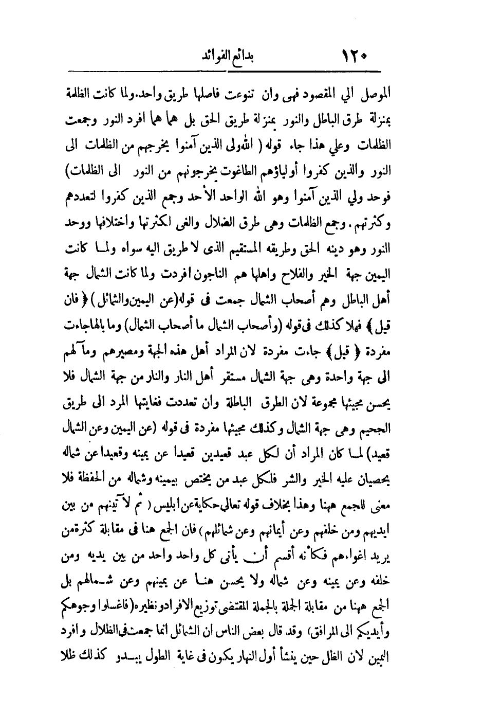 الموصل إلى المقصود فهي وإن تنوعت فأصلها طريق واحد ولما كانت الظلمة بمنزلة طرق الباطل والنور بمنزلة طريق الحق فقد أفرد النور وجمعت الظلمات وعلى هذا جاء قوله: {اللَّهُ وَلِيُّ الَّذِينَ آمَنُوا يُخْرِجُهُمْ مِنَ الظُّلُمَاتِ إِلَى النُّورِ وَالَّذِينَ كَفَرُوا أَوْلِيَاؤُهُمُ الطَّاغُوتُ يُخْرِجُونَهُمْ مِنَ النُّورِ إِلَى الظُّلُمَاتِ} فوحد ولي الذين آمنوا وهو الله الواحد الأحد وجمع الذين كفروا لتعددهم وكثرتهم وجمع الظلمات وهي طرق الضلال والغي لكثرتها واختلافها ووحد النور وهو دينه الحق وطريقه المستقيم الذي لا طريق إليه سواه ولما كانت اليمين جهة الخير والفلاح وأهلها هم الناجون أفردت ولما كانت الشمال جهة أهل الباطل وهم أصحاب الشمال جمعت في قوله: {عَنِ الْيَمِينِ وَالشَّمَائِلِ} فإن قيل فهلا كذلك في قوله: {وَأَصْحَابُ الشِّمَالِ مَا أَصْحَابُ الشِّمَالِ} وما بالها جاءت مفردة قيل: جاءت مفردة لأن المراد أهل هذه الجهة ومصيرهم ومآلهم إلى جهة واحدة وهي جهة الشمال مستقر أهل النار والنار من جهة الشمال فلا يحسن مجيئها مجموعة لأن الطرق الباطلة وإن تعددت فغايتها المرد إلى طريق الجحيم وهي جهة الشمال وكذلك مجيئها مفردة في قوله: {عَنِ الْيَمِينِ وَعَنِ الشِّمَالِ قَعِيدٌ} لما كان المراد أن لكل عبد قعيدين قعيدا عن يمينه وقعيدا عن شماله يحصيان عليه الخير والشر فلكل عبد من يختص بيمينه وشماله من الحفظة فلا معنى للجمع هاهنا وهذا بخلاف قوله تعالى حكاية عن إبليس: {ثُمَّ لآتِيَنَّهُمْ مِنْ بَيْنِ أَيْدِيهِمْ وَمِنْ خَلْفِهِمْ وَعَنْ أَيْمَانِهِمْ وَعَنْ شَمَائِلِهِمْ} فإن الجمع هنا في مقابلة كثرة من يريد إغواءهم فكأنه أقسم أن يأتي كل واحد من بين يديه ومن خلفه وعن يمينه وعن شماله ولا يحسن هنا عن يمينهم وعن شمالهم بل الجمع هاهنا من مقابلة الجملة بالجملة المقتضى توزيع الأفراد ونظيره: {فَاغْسِلُوا وُجُوهَكُمْ وَأَيْدِيَكُمْ إِلَى الْمَرَافِقِ} وقد قال بعض الناس: إن الشمال إنما جمعت في الظلال وأفرد اليمين لأن الظل حين ينشأ أول النهار يكون في غاية الطول يبدو كذلك ظلا