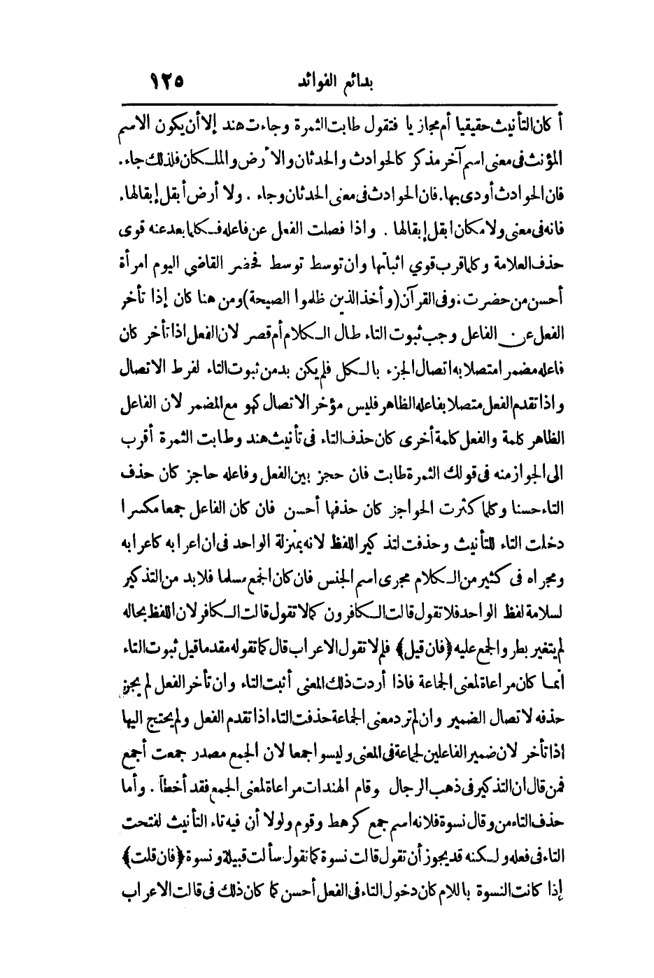 أكان التأنيث حقيقيا أم مجازيا فتقول طابت الثمرة وجاءت هند إلا أن يكون الاسم المؤنث في معنى اسم آخر مذكر كالحوادث والحدثان والأرض فلذلك جاء فإن الحوادث أودى بها فإن الحوادث في معنى الحدثان وجاء ولا أرض أبقل إبقالها فإنه في معنى ولا مكان أبقل إبقالها وإذا فصلت الفعل عن فاعله فكلما بعد عنه قوي حذف العلامة وكلما قرب قوي إثباتها وإن توسط توسط ف حضر القاضي اليوم امرأة أحسن من حضرت وفي القرآن: {وَأَخَذَ الَّذِينَ ظَلَمُوا الصَّيْحَةُ} ومن هنا كان إذا تأخر الفعل عن الفاعل وجب ثبوت التاء طال الكلام أم قصر لأن الفعل إذا تأخر كان فاعله مضمرا متصلا به اتصال الجزء بالكل فلم يكن بد من ثبوت التاء لفرط الاتصال وإذا تقدم الفعل متصلا بفاعله الظاهر فليس مؤخر الاتصال كهو مع المضمر لأن الفاعل الظاهر كلمة والفعل كلمة أخرى كان حذف التاء في تأنيث هند وطابت الثمرة أقرب إلى الجواز منه في قولك الثمرة طابت فإن حجز بين الفعل وفاعله حاجز كان حذف التاء حسنا وكلما كثرت الحواجز كان حذفها أحسن فإن كان الفاعل جمعا مكسرا دخلت التاء للتأنيث وحذفت لتذكير اللفظ لأنه بمنزلة الواحد في أن إعرابه كإعرابه ومجراه في كثير من الكلام مجرى اسم الجنس فإن كان الجمع مسلما فلا بد من التذكير لسلامة لفظ الواحدة فلا تقول قالت الكافرون كما لا تقول قالت الكافر لأن اللفظ بحاله لم يتغير بطرو الجمع عليه فإن قيل: فلم لا تقول الأعراب قال: كما تقوله مقدما قيل ثبوت التاء إنما كان مراعاة لمعنى الجماعة فإذا أردت ذلك المعنى أثبت التاء وإن تأخر الفعل لم يجز حذفه لاتصال الضمير وإن لم ترد معنى الجماعة حذفت التاء إذا تقدم الفعل ولم يحتج إليها إذا تأخر لأن ضمير الفاعلين لجماعة في المعنى وليسوا جمعا لأن الجمع مصدر جمعت أجمع فمن قال: إن التذكير في ذهب الرجال وقام الهندات مراعاة لمعنى الجمع فقد أخطأ وأما حذف التاء من وقال نسوة فلأنه اسم جمع كرهط وقوم ولولا أن فيه تاء التأنيث لفتحت التاء في فعله ولكنه قد يجوز أن تقول قالت نسوة كما تقول: سألت قبيلة ونسوة فإن قلت: إذا كانت النسوة باللام كان دخول التاء في الفعل أحسن كما كان ذلك في قالت الأعراب