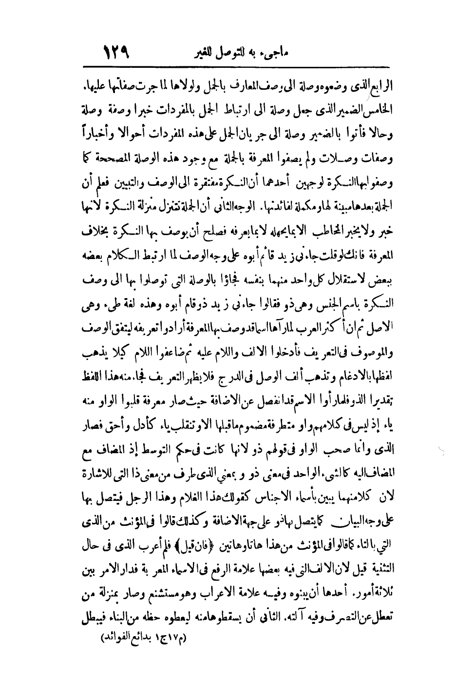 الرابع الذي وضعوه وصلة إلى وصف المعارف بالجمل ولولاها لما جرت صفاتها عليها الخامس الضمير الذي جعل وصلة إلى ارتباط الجمل بالمفردات خبرا وصفة وصلة وحالا فأتوا بالضمير وصلة إلى جريان الجمل على هذه المفردات أحوالا وأخبارا وصفات وصلات ولم يصفوا المعرفة بالجملة مع وجود هذه الوصلة المصححة كما وصفوا بها النكرة لوجهين أحدهما أن النكرة مفتقرة إلى الوصف والتبيين فعلم أن الجملة بعدها مبينة لها ومكملة لفائدتها الوجه الثاني أن الجملة تتنزل منزلة النكرة لأنها خبر ولا يخبر المخاطب إلا بما يجهله لا بما يعرفه فصلح أن يوصف بها النكرة بخلاف المعرفة فإنك لو قلت جاءني زيد قائم أبوه على وجه الوصف لما ارتبط الكلام بعضه ببعض لاستقلال كل واحد منهما بنفسه فجاءوا بالوصلة التي توصلوا بها إلى وصف النكرة باسم الجنس وهي ذو فقالوا جاءني زيد ذو قام أبوه وهي لغة طيء وهي الأصل ثم إن أكثر العرب لما رآها اسما قد وصف بها المعرفة أرادوا تعريفه ليتفق الوصف والموصوف في التعريف فأدخلوا الألف واللام عليه ثم ضاعفوا اللام كيلا يذهب لفظها بالإدغام وتذهب ألف الوصل في الدرج فلا يظهر التعريف فجاء منه هذا اللفظ تقديرا ل ذو فلما رأوا الاسم قد انفصل عن الإضافة حيث صار معرفة قلبوا الواو منه ياء إذ ليس في كلامهم واو متطرفة مضموم ما قبلها إلا وتنقلب ياء كأدل وأحق وإنما صحب الواو في قولهم: ذو لأنها كانت في حكم التوسط إذ المضاف مع المضاف إليه كالشيء الواحد في معنى ذو وبمعنى الذي طرف من معنى ذا التي للإشارة لأن كلا منهما يبين بأسماء الأجناس كقولك: هذا الغلام وهذا الرجل فيتصل بها على وجه البيان كما يتصل بها ذو على جهة الإضافة وكذلك قالوا في المؤنث من الذي التي بالتاء كما قالوا في المؤنث من هذا هاتان وهاتين إعراب الذي في حالة التثنية فإن قيل: فلم أعرب الذي في حالة التثنية قيل: لأن الألف التي فيه بعضها علامة الرفع في الأسماء المعربة فدار الأمر بين ثلاثة أمور أحدها أن يبنوه وفيه علامة الإعراب وهو مستشنع وصار بمنزلة من تعطل عن التصرف وفيه آلته الثاني أن يسقطوها منه ليعطوه حظه من البناء فيبطل