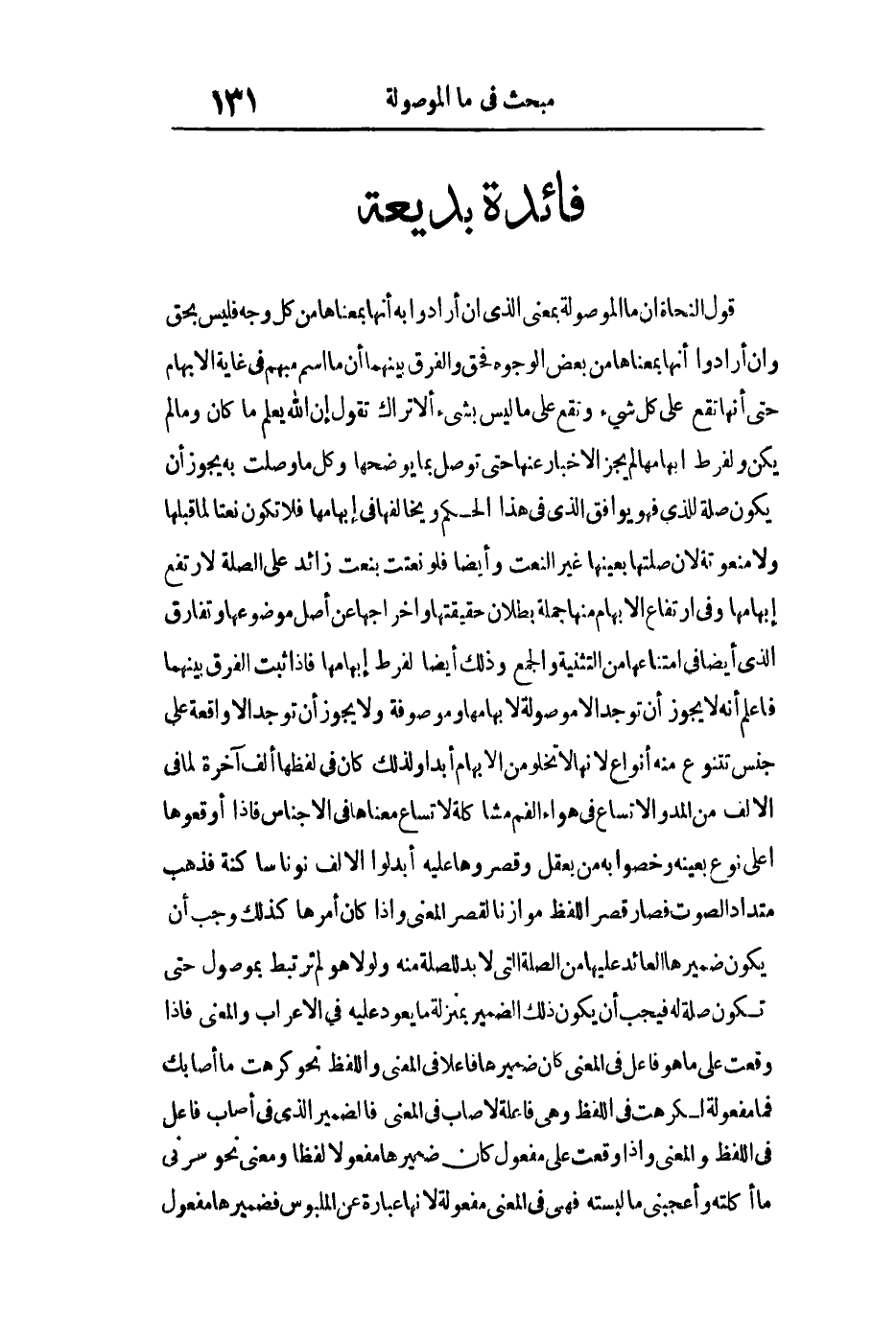 قول النحاة إن ما الموصولة بمعنى الذي إن أرادوا به أنها بمعناها من كل وجه فليس بحق وإن أرادوا أنها بمعناها من بعض الوجوه فحق والفرق بينهما أن ما اسم مبهم في غاية الإبهام حتى أنها تقع على كل شيء وتقع على ما ليس بشيء ألا تراك تقول إن الله يعلم ما كان وما لم يكن لفرط إبهامها لم يجز الإخبار عنها حتى توصل بما يوضحها وكل ما وصلت به يجوز أن يكون صلة ل الذي فهو يوافق الذي في هذا الحكم ويخالفها في إبهامها فلا تكون نعتا لما قبلها ولا منعوتة لأن صلتها بعينها غير النعت وأيضا فلو نعتت بنعت زائد على الصلة لارتفع إبهامها وفي ارتفاع الإبهام منها جملة بطلان حقيقتها وإخراجها عن أصل موضوعها وتفارق الذي أيضا في امتناعها من التثنية والجمع وذلك أيضا لفظ إبهامها فإذا ثبت الفرق بينهما فاعلم أنه لا يجوز أن توجد إلا موصولة لإبهامها وموصوفة ولا يجوز أن توجد إلا واقعة على جنس تتنوع منه أنواع لأنها لا تخلو من الإبهام أبدا ولذلك كان في لفظها ألف آخره لما في الألف من المد والاتساع في هواء الفم مشاكلة لاتساع معناها في الأجناس فإذا أوقعوها على نوع بعينه وخصوا به من يعقل وقصروها عليه أبدلوا الألف نونا ساكنة فذهب امتداد الصوت فصار قصر اللفظ موازنا لقصر المعنى وإذا كان أمرها كذلك وجب أن يكون ضميرها العائد عليها من الصلة التي لا بد للصلة منه ولولا هو لم ترتبط بموصول حتى تكون صلة له فيجب أن يكون ذلك الضمير بمنزلة ما يعود عليه في الإعراب والمعنى فإذا وقعت على ما هو فاعل في المعنى كان ضميرها فاعلا في المعنى واللفظ نحو كرهت ما أصابك ف ما مفعولة لكرهت في اللفظ وهي فاعلة لأصاب في المعنى فالضمير الذي في أصاب فاعل في اللفظ والمعنى وإذا وقعت على مفعول كان ضميرها مفعولا لفظا ومعنى نحو سرني ما أكلته وأعجبني ما لبسته فهي في المعنى مفعولة لأنها عبارة عن الملبوس فضميرها مفعول