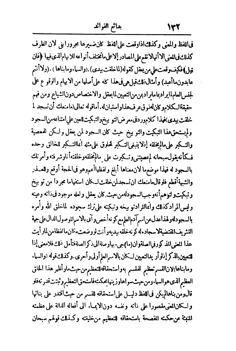في اللفظ والمعنى وكذلك إذا وقعت على اللفظ كان ضميرها مجرورا ب في لأن الظرف كذلك في المعنى إلا أنها لا تقع على المصادر إلا على ما تختلف أنواعه للإبهام الذي فيها فإن قيل: فكيف وقعت على من يعقل كقوله: {لِمَا خَلَقْتُ بِيَدَيَّ} {وَالسَّمَاءِ وَمَا بَنَاهَا} {وَلا أَنْتُمْ عَابِدُونَ مَا أَعْبُدُ} وأمثال ذلك قيل: هي في هذا كله على أصلها من الإبهام والوقوع على الجنس العام لما يراد بما ما يراد بمن من التعيين لما يعقل والاختصاص دون الشيوع ومن فهم حقيقة الكلام وكان له ذوق عرف هذا واستبان له وأما قوله تعالى: {ما منعك أن تسجد لما خلقت بيدي} فهذا كلام ورد في معرض التوبيخ والتبكيت للعين على امتناعه من السجود ولم يستحق هذا التبكيت والتوبيخ حيث كان السجود لمن يعقل ولكن للمعصية والتكبر على ما لم يخلقه إذ لا ينبغي التكبر لمخلوق على مثله إنما التكبر للخالق وحده فكأنه يقول سبحانه: لم عصيتني وتكبرت على ما لم تخلقه وخلقته أنا وشرفته وأمرتك بالسجود له فهذا موضع ما لأن معناها أبلغ ولفظها أعم وهو في الحجة أوقع وللعذر والشبهة أقطع فلو قال: ما منعك أن تسجد لمن خلقت لكان استفهاما مجردا من توبيخ وتبكيت ولتوهم أنه وجب السجود له من حيث كان يعقل ولعله موجود في ذاته وعينه وليس المراد كذلك وإنما المراد توبيخه وتبكيته على ترك سجوده لما خلق الله وأمره بالسجود له ولهذا عدل عن اسم آدم العلم مع كونه أخص وأتى بالاسم الموصول الدال على جهة التشريف المقتضية لسجوده له كونه خلقه بيديه وأنت لو وضعت مكان ما لفظة من لما رأيت هذا المعنى المذكور في الصلة وأن ما جيء بها وصلة إلى ذكر الصلة فتأمل ذلك فلا معنى إذا للتعيين بالذكر إذ لو أريد التعيين لكان بالاسم العلم أولى وأحرى وكذلك قوله: والسماء وما بناها لأن القسم تعظيم للمقسم به واستحقاقه للتعظيم من حيث ما وأظهر هذا الخلق العظيم الذي هو السماء ومن حيث سواها وزينها بحكمته فاستحق التعظيم وثبتت قدرته فلو قال: ومن بناها لم يكن في اللفظ دليل على استحقاقه للقسم من حيث اقتدر على بنائها ولكان المعنى مقصورا على ذاته ونفسه دون الإيماء إلى أفعاله الدالة على عظمته المنبئة عن حكمته المفصحة باستحقاقه للتعظيم من خليقته وكذلك قولهم: سبحان
