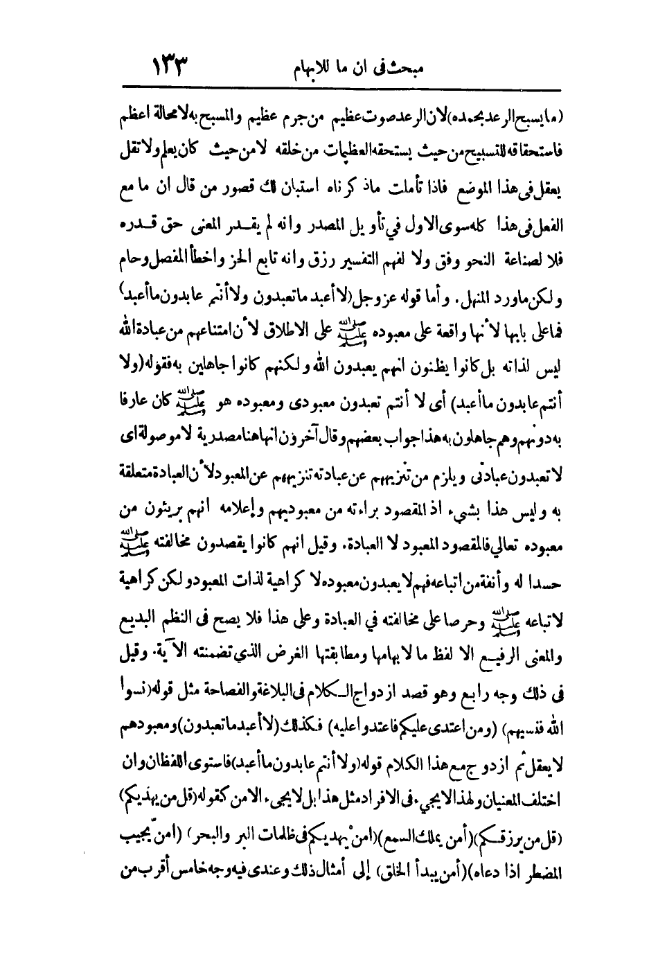 ما يسبح الرعد بحمده" لأن الرعد صوت عظيم من جرم عظيم والمسبح به لا محالة أعظم فاستحقاقه للتسبيح من حيث يستحقه العظيمات من خلقه لا من حيث كان يعلم ولا تقل يعقل في هذا الموضع فإذا تأملت ما ذكرناه استبان لك قصور من قال أن ما مع الفعل في هذا كله سوى الأول في تأويل المصدر وأنه لم يقدر المعنى حق قدره فلا لصناعة النحو وفق ولا لفهم التفسير رزق وأنه تابع الحز وأخطأ المفصل وحام ولكن ما ورد المنهل فوائد سورة الكافرون وأما قوله عز وجل: {لا أَعْبُدُ مَا تَعْبُدُونَ وَلا أَنْتُمْ عَابِدُونَ مَا أَعْبُدُ} فإن ما على بابها لأنها واقعة على معبوده صلى الله عليه وسلم على الإطلاق لأن امتناعهم من عبادة الله تعالى ليس لذاته بل كانوا يظنون أنهم يعبدون الله تعالى ولكنهم كانوا جاهلين به فقوله: {وَلا أَنْتُمْ عَابِدُونَ مَا أَعْبُدُ} أي لا أنتم تعبدون معبودي ومعبوده هو صلى الله عليه وسلم كان عارفا به دونهم وهم جاهلون به هذا جواب بعضهم قال آخرون: إنها هنا مصدرية لا موصولة أي لا تعبدون عبادتي ويلزم من تنزيههم عن عبادته تنزيههم عن المعبود لأن العبادة متعلقة به وليس هذا بشيء إذ المقصود براءته من معبوديهم وإعلامه أنهم بريئون من معبوده تعالى فالمقصود المعبود لا العبادة وقيل: إنهم كانوا يقصدون مخالفته صلى الله عليه وسلم حسدا له وأنفة من إتباعه فهم لا يعبدون معبوده لا كراهية لذات المعبود ولكن كراهية لاتباعه صلى الله عليه وسلم وحرصا على مخالفته في العبادة وعلى هذا فلا يصح في النظم البديع والمعنى الرفيع إلا لفظ ما لإبهامها ومطابقتها الغرض الذي تضمنته الآية وقيل في ذلك وجه رابع: وهو قصد ازدواج الكلام في البلاغة والفصاحة مثل قوله: {نَسُوا اللَّهَ فَنَسِيَهُمْ} و: {فَمَنِ اعْتَدَى عَلَيْكُمْ فَاعْتَدُوا عَلَيْهِ} فكذلك: {لا أَعْبُدُ مَا تَعْبُدُونَ} ومعبودهم لا يعقل ثم ازدوج مع هذا الكلام قوله: {وَلا أَنْتُمْ عَابِدُونَ مَا أَعْبُدُ} فاستوى اللفظان وإن اختلف المعنيان ولهذا لا يجيء في الإفراد مثل هذا بل لا يجيء إلا من كقوله: {أَمَّنْ يَهْدِيكُمْ} {قُلْ مَنْ يَرْزُقُكُمْ} {أَمَّنْ يَمْلِكُ السَّمْعَ} {أَمَّنْ يَهْدِيكُمْ فِي ظُلُمَاتِ الْبَرِّ وَالْبَحْرِ} {أَمَّنْ يُجِيبُ الْمُضْطَرَّ إِذَا دَعَاهُ} {أَمَّنْ يَبْدأُ الْخَلْقَ} إلى أمثال ذلك وعندي فيه وجه خامس أقرب من