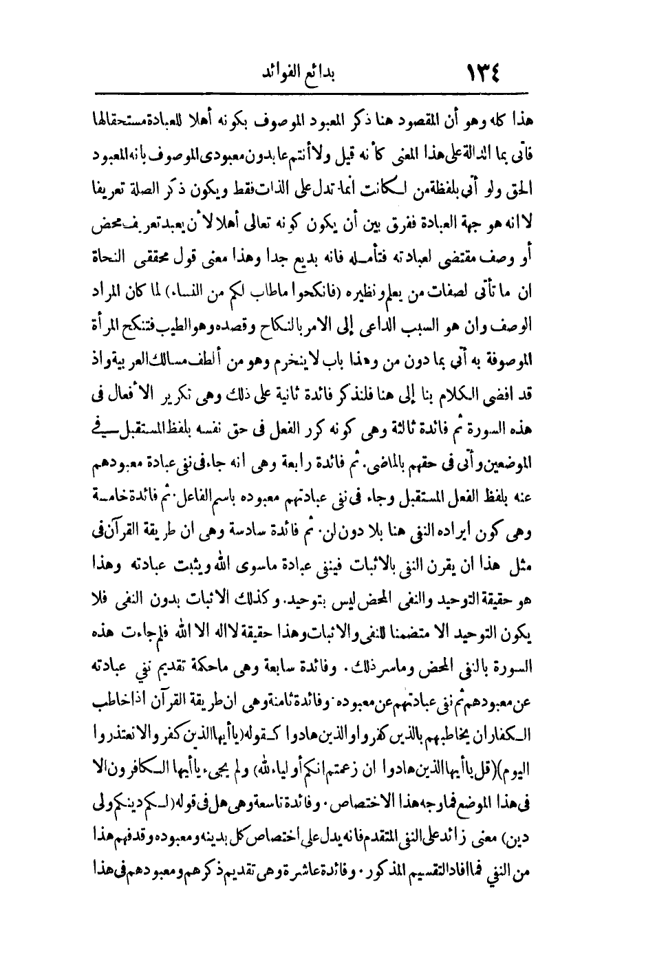 هذا كله وهو أن المقصود هنا ذكر المعبود الموصوف بكونه أهلا للعبادة مستحقا لها فأتى ب ما الدالة على هذا المعنى كأنه قيل: ولا أنتم عابدون معبودي الموصوف بأنه المعبود الحق ولو أتى بلفظة من لكانت إنما تدل على الذات فقط ويكون ذكر الصلة تعريفا لا أنه هو جهة العبادة ففرق بين أن يكون كونه تعالى أهلا لأن يعبد تعريف محض أو وصف مقتضى لعبادته فتأمله فإنه بديع جدا وهذا معنى قول محققي النحاة: أن ما تأتي لصفات من يعلم ونظيره: {فَانْكِحُوا مَا طَابَ لَكُمْ مِنَ النِّسَاءِ} لما كان المراد الوصف وأن هو السبب الداعي إلى الأمر بالنكاح وقصده وهو الطيب فتنكح المرأة الموصوفة به أتى بما دون من وهذا باب لا ينخرم وهو من ألطف مسالك العربية وإذ قد أفضى الكلام بنا إلى هنا فلنذكر فائدة ثانية: تكرير الأفعال في هذه السورة ثم فائدة ثالثة: كونه كرر الفعل في حق نفسه بلفظ المستقبل في الموضعين وأتى في حقهم بالماضي ثم فائدة رابعة: وهي أنه جاء في نفي عبادة معبودهم عنه بلفظ الفعل المستقبل وجاء في نفي عبادتهم معبوده باسم الفاعل ثم فائدة خامسة: وهي كون إيراده النفي هنا ب لا دون لن ثم فائدة سادسة: وهي أن طريقة القرآن في مثل هذا أن يقرن النفي بالإثبات فينفي عبادة ما سوى الله ويثبت عبادته وهذا هو حقيقة التوحيد والنفي المحض ليس بتوحيد وكذلك الإثبات بدون النفي فلا يكون التوحيد إلا متضمنا للنفي والإثبات وهذا حقيقة لا إله إلا الله فلم جاءت هذه السورة بالنفي المحض وما سر ذلك وفائدة سابعة: وهي ما حكمة تقديم نفي عبادته عن معبودهم ثم نفي عبادتهم عن معبوده وفائدة ثامنة: وهي أن طريقة القرآن إذا خاطب الكفار أن يخاطبهم بالذين كفروا والذين هادوا كقوله: {يَا أَيُّهَا الَّذِينَ كَفَرُوا لا تَعْتَذِرُوا الْيَوْمَ} {قُلْ يَا أَيُّهَا الَّذِينَ هَادُوا إِنْ زَعَمْتُمْ أَنَّكُمْ أَوْلِيَاءُ لِلَّهِ} ولم يجيء يا أيها الكافرون إلا في هذا الموضع فما وجه هذا الاختصاص وفائدة تاسعة: وهي هل في قوله: {لَكُمْ دِينُكُمْ وَلِيَ دِينِ} معنى زائد على النفي المتقدم فإنه يدل على اختصاص كل بدينه ومعبوده وقد فهم هذا من النفي فما أفاد التقسيم المذكور وفائدة عاشرة: وهي تقديم ذكرهم ومعبودهم في هذا