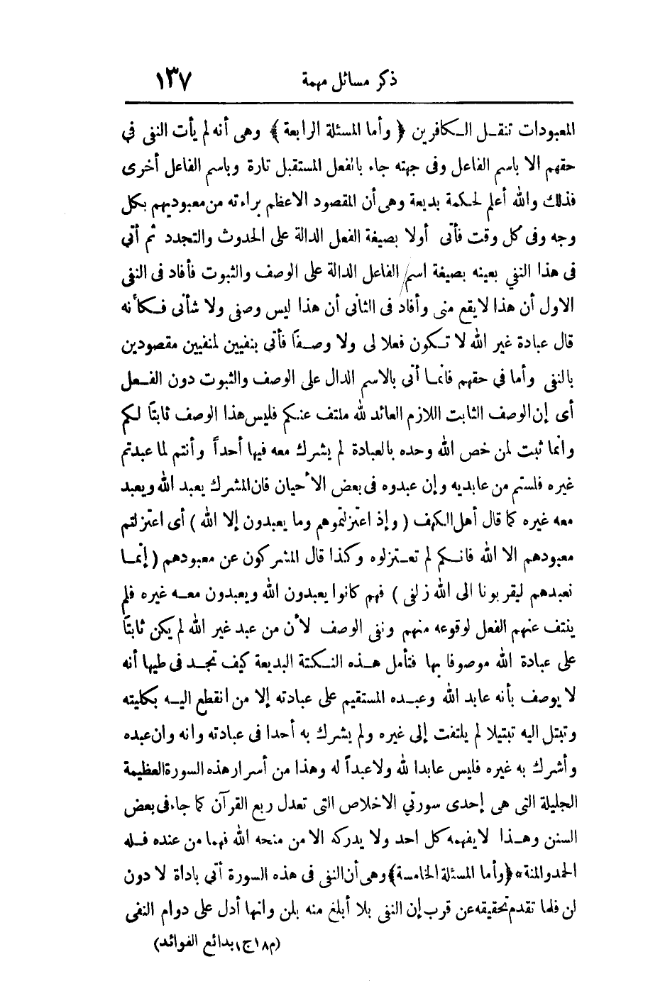 المعبودات تنقل الكافرين أما المسألة الرابعة: وهي أنه لم يأت النفي في حقهم إلا باسم الفاعل وفي جهته جاء بالفعل المستقبل تارة وباسم الفاعل أخرى فذلك والله أعلم لحكمة بديعة وهي أن المقصود الأعظم براءته من معبوديهم بكل وجه وفي كل وقت فأتى أولا بصيغة الفعل الدالة على الحدوث والتجدد ثم أتى في هذا النفي بعينه بصيغة اسم الفاعل الدالة على الوصف والثبوت فأفاد في النفي الأول أن هذا لا يقع مني وأفاد في الثاني أن هذا ليس وصفي ولا شأني فكأنه قال: عبادة غير الله لا تكون فعلا لي ولا وصفا فأتى بنفيين لمنفيين مقصودين بالنفي وأما في حقهم فإنما أتى بالاسم الدال على الوصف والثبوت دون الفعل أي أن الوصف الثابت اللازم العائد لله منتف عنكم فليس هذا الوصف ثابتا لكم وإنما ثبت لمن خص الله وحده بالعبادة لم يشرك معه فيها أحدا وأنتم لما عبدتم غيره فلستم من عابديه وإن عبدوه في بعض الأحيان فإن المشرك يعبد الله ويعبد معه غيره كما قال أهل الكهف: {وَإِذِ اعْتَزَلْتُمُوهُمْ وَمَا يَعْبُدُونَ إِلا اللَّهَ} أي اعتزلتم معبودهم إلا الله فإنكم لم تعتزلوه وكذا قال المشركون عن معبودهم: {مَا نَعْبُدُهُمْ إِلا لِيُقَرِّبُونَا إِلَى اللَّهِ زُلْفَى} فهم كانوا يعبدون الله ويعبدون معه غيره فلم ينتف عنهم الفعل لوقوعه منهم ونفي الوصف لأن من عبد غير الله لم يكن ثابتا على عبادة الله موصوفا بها فتأمل هذه النكتة البديعة كيف تجد في طيها أنه لا يوصف بأنه عابد الله وعبده المستقيم على عبادته إلا من انقطع إليه بكليته وتبتل إليه تبتيلا لم يلتفت إلى غيره لم يشرك به أحدا في عبادته وأنه وإن عبده وأشرك به غيره فليس عابدا لله ولا عبدا له وهذا من أسرار هذه السورة العظيمة الجليلة التي هي إحدى سورتي الإخلاص التي تعدل ربع القرآن كما جاء في بعض السنن وهذا لا يفهمه كل أحد ولا يدركه إلا من منحه الله فهما من عنده فلله الحمد والمنة وأما المسألة الخامسة: وهي أن النفي في هذه السورة أتى بأداة لا دون لن وذلك لأن النفي ب لا أبلغ منه ب لن وأن لا أدل على دوام النفي