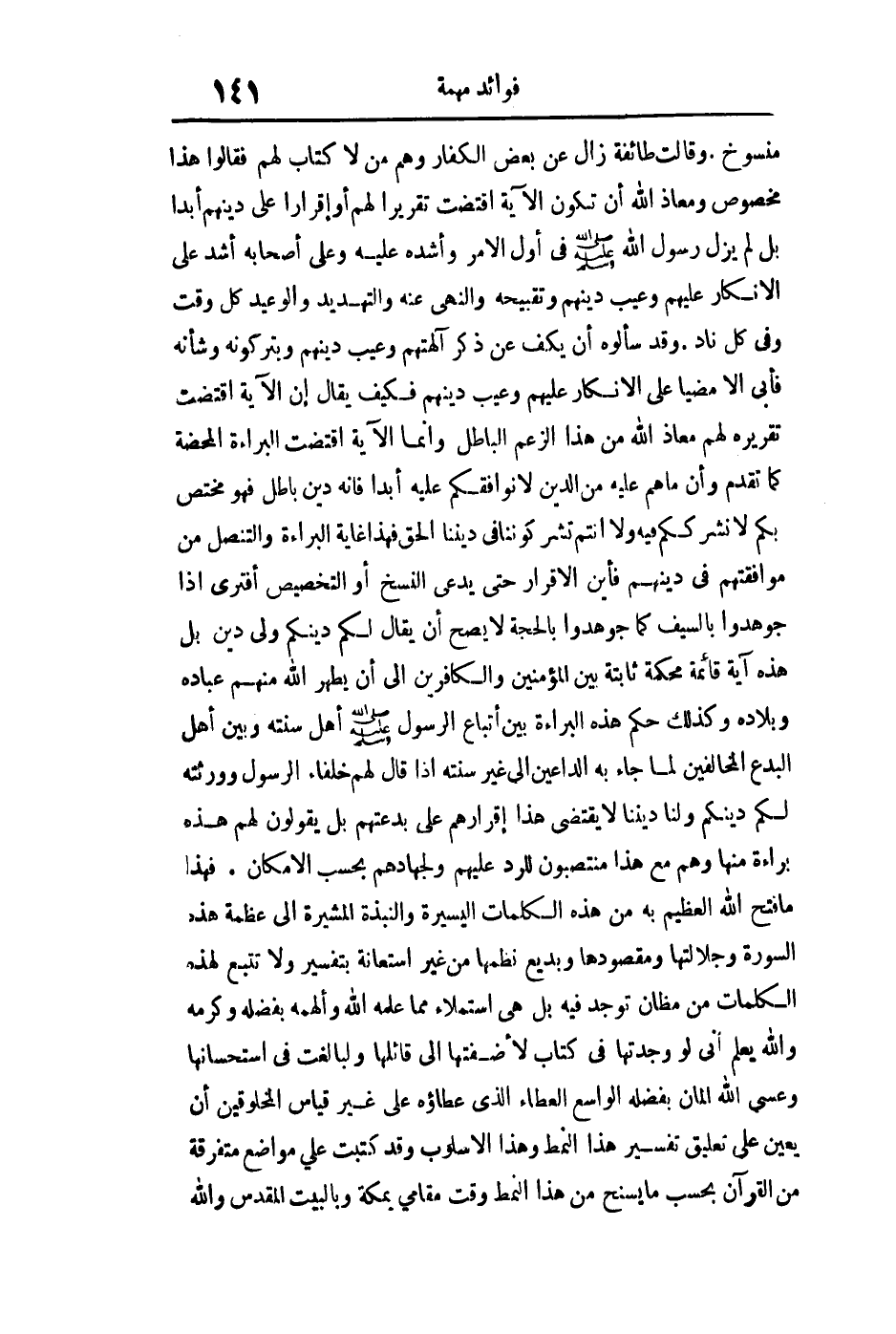 منسوخ وقالت طائفة: زال عن بعض الكفار وهم من لا كتاب لهم فقالوا هذا مخصوص ومعاذ الله أن تكون الآية اقتضت تقريرا لهم أو إقرارا على دينهم أبدا بل لم يزل رسول الله صلى الله عليه وسلم في أول الأمر وأشده عليه وعلى أصحابه أشد على الإنكار عليهم وعيب دينهم وتقبيحه والنهي عنه والتهديد والوعيد كل وقت وفي كل ناد وقد سألوه أن يكف عن ذكر آلهتهم وعيب دينهم ويتركونه وشأنه فأبى إلا مضيا على الإنكار عليهم وعيب دينهم فكيف يقال إن الآية اقتضت تقريره لهم معاذ الله من هذا الزعم الباطل وإنما الآية اقتضت البراءة المحضة كما تقدم وأن ما هم عليه من الدين لا نوافقكم عليه أبدا فإنه دين باطل فهو مختص بكم لا نشرككم فيه ولا أنتم تشركوننا في ديننا الحق فهذا غاية البراءة والتنصل من موافقتهم في دينهم فأين الإقرار حتى يدعي النسخ أو التخصيص أفترى إذا جوهدوا بالسيف كما جوهدوا بالحجة لا يصح أن يقال: {لَكُمْ دِينُكُمْ وَلِيَ دِينِ} بل هذه آية قائمة محكمة ثابتة بين المؤمنين والكافرين إلى أن يظهر الله منهم عباده وبلاده وكذلك حكم هذه البراءة بين أتباع الرسول صلى الله عليه وسلم أهل سنته وبين أهل البدع المخالفين لما جاء به الداعين إلى غير سنته إذا قال لهم خلفاء الرسول وورثته لكم دينكم ولنا ديننا لا يقتضي هذا إقرارهم على بدعتهم بل يقولون لهم هذه براءة منها وهم مع هذا منتصبون للرد عليهم ولجهادهم بحسب الإمكان فهذا ما فتح الله العظيم به من هذه الكلمات اليسيرة والنبذة المشيرة إلى عظمة هذه السورة وجلالتها ومقصودها وبديع نظمها من غير استعانة بتفسير ولا تتبع لهذه الكلمات من مظان توجد فيه بل هي استملاء مما علمه الله وألهمه بفضله وكرمه والله يعلم أني لو وجدتها في كتاب لأضفتها إلى قائلها ولبالغت في استحسانها وعسى الله المان بفضله الواسع العطاء الذي عطاؤه على غير قياس المخلوقين أن يعين على تعليق تفسير هذا النمط وهذا الأسلوب وقد كتبت على مواضع متفرقة من القرآن بحسب ما يسنح من هذا النمط وقت مقامي بمكة وبالبيت المقدس والله