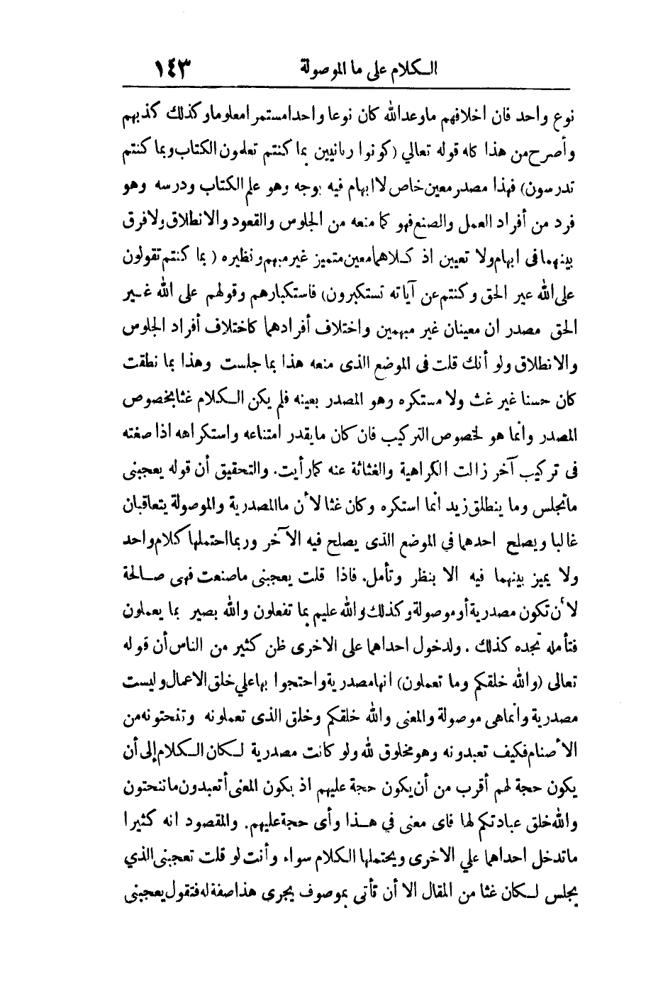 نوع واحد فإن إخلافهم ما وعد الله كان نوعا واحدا مستمرا معلوما وكذلك كذبهم وأصرح من هذا كله قوله تعالى: {كُونُوا عِبَاداً لِي مِنْ دُونِ اللَّهِ وَلَكِنْ كُونُوا رَبَّانِيِّينَ بِمَا كُنْتُمْ تُعَلِّمُونَ الْكِتَابَ وَبِمَا كُنْتُمْ تَدْرُسُونَ} فهذا مصدر معين خاص لا إبهام فيه بوجه وهو علم الكتاب ودرسه وهو فرد من أفراد العمل والصنع فهو كما منعه من الجلوس والقعود والانطلاق ولا فرق بينهما في إبهام ولا تعيين إذ كلاهما معين متميز غير مبهم ونظيره {بما كنتم تقولون على الله غير الحق وكنتم عن آياته تستكبرون} [الأنعام 93] فاستكبارهم وقولهم على الله غير الحق مصدران معينان غير مبهمين واختلاف أفرادهما كاختلاف أفراد الجلوس والانطلاق ولو أنك قلت في الموضوع الذي منعه هذا بما جلست وهذا بما نطقت كان حسنا غير غث ولا مستكره وهو المصدر بعينه فلم يكن الكلام غثا بخصوص المصدر وإنما هو لخصوص التركيب فإن كان بقدر امتناعه واستكراهه إذا صنعته في تركيب آخر زالت الكراهية والغثاثة عنه كما رأيت ما الموصولة والتحقيق أن قوله يعجبني ما تجلس وما ينطلق زيد إنما استكره وكان غثا لأن ما المصدرية والموصولة يتعاقبان غالبا ويصلح أحدهما في الموضع الذي يصلح فيه الآخر وربما احتملها كلام واحد ولا يميز بينهما فيه إلا بنظر وتأمل فإذا قلت يعجبني ما صنعت فهي صالحة لأن تكون مصدرية أو موصولة وكذلك والله عليم بما يفعلون والله بصير بما يعملون فتأمله تجده كذلك ولدخول إحداهما على الأخرى ظن كثير من الناس أن قوله تعالى: {وَاللَّهُ خَلَقَكُمْ وَمَا تَعْمَلُونَ} أنها مصدرية واحتجوا بها على خلق الأعمال وليست مصدرية وإنما هي موصولة والمعنى والله خلقكم وخلق الذي تعملونه وتنحتونه من الأصنام فكيف تعبدونه وهو مخلوق لله ولو كانت مصدرية لكان الكلام إلى أن يكون حجة لهم أقرب من أن يكون حجة عليهم إذ يكون المعنى أتعبدون ما تنحتون والله خلق عبادتكم لها فأي معنى في هذا وأي حجة عليهم والمقصود أنه كثيرا ما تدخل إحداهما على الأخرى ويحتملها الكلام سواء وأنت لو قلت يعجبني الذي يجلس لكان غثا من المقال إلا أن تأتي بموصوف يجري هذا صفة له فتقول يعجبني
