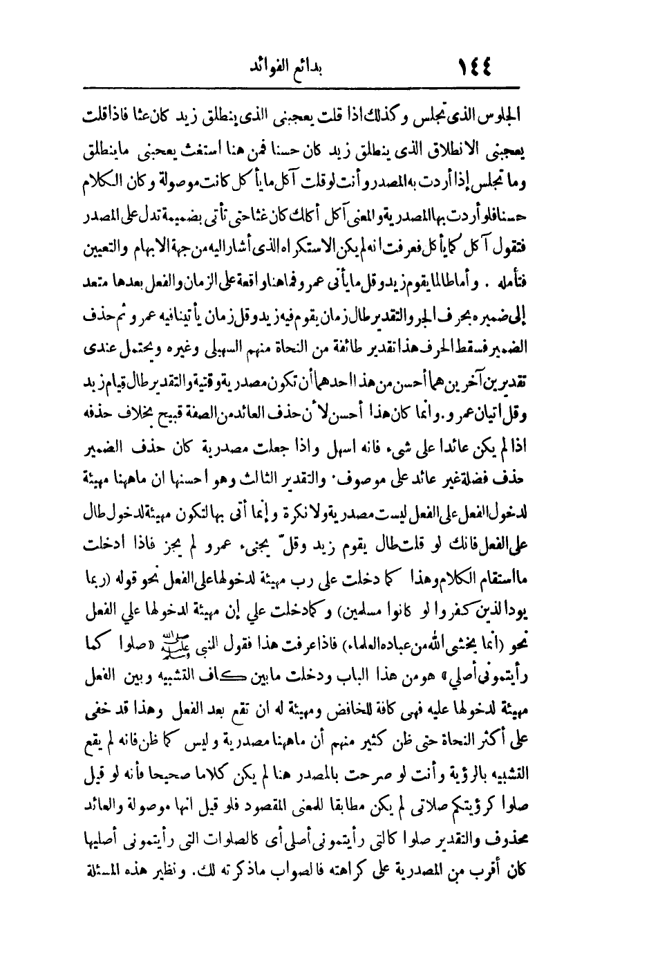 الجلوس الذي تجلس وكذلك إذا قلت يعجبني الذي ينطلق زيد كان غثا فإذا قلت يعجبني الانطلاق الذي ينطلق زيد كان حسنا فمن هنا يعجبني ما ينطلق وما تجلس إذا أردت به المصدر وأنت لو قلت آكل ما يأكل كانت موصولة وكان الكلام حسنا فلو أردت بها المصدرية والمعنى آكل أكلك كان غثا حتى تأتي بضميمة تدل على المصدر فتقول آكل كما يأكل فعرفت أنه لم يكن الاستكراه الذي أشار إليه من جهة الإبهام والتعيين فتأمله وأما طالما يقوم زيد وقل ما يأتي عمرو ف ما هنا واقعة على الزمان والفعل بعدها متعد إلى ضميره بحرف الجر والتقدير طال زمان يقوم فيه زيد وقل زمان يأتينا فيه عمرو ثم حذف الضمير فسقط الحرف هذا تقدير طائفة من النحاة منهم السهيلي وغيره ويحتمل عندي تقديرين آخرين هما أحسن من هذا أحدهما أن تكون مصدرية وقتية والتقدير طال قيام زيد وقل إتيان عمرو وإنما كان هذا أحسن لأن حذف العائد من الصفة قبيح بخلاف حذفه إذا لم يكن عائدا على شيء فإنه أسهل وإذا جعلت مصدرية كان حذف الضمير حذف فضلة غير عائد على موصوف والتقدير الثاني وهو أحسنها أن ما هاهنا مهيأة لدخول الفعل على الفعل ليست مصدرية ولا نكرة وإنما أتى بها لتكون مهيأة لدخول طال على الفعل فإنك لو قلت طال يقوم زيد وقل يجني عمرو لم يجز فإذا أدخلت ما استقام الكلام وهذا كما دخلت على رب مهيأة لدخولها على الفعل نحو قوله: {رُبَمَا يَوَدُّ الَّذِينَ كَفَرُوا لَوْ كَانُوا مُسْلِمِينَ} وكما دخلت على إن مهيأة لدخولها على الفعل نحو: {إِنَّمَا يَخْشَى اللَّهَ مِنْ عِبَادِهِ الْعُلَمَاءُ} فإذا عرفت هذا فقول النبي صلى الله عليه وسلم: "صلوا كما رأيتموني أصلي " رواه البخاري ومسلم هو من هذا الباب ودخلت ما بين كاف التشبيه وبين الفعل مهيأة لدخولها عليه في كافة للخافض ومهيأة له أن تقع بعد الفعل وهذا قد خفي على أكثر النحاة حتى ظن كثير منهم أن ما هاهنا مصدرية وليس كما ظن فإنه لم يقع التشبيه بالرؤية وأنت لو صرحت بالمصدر هنا لم يكن كلاما صحيحا فإنه لو قيل صلوا كرؤيتكم صلاتي لم يكن مطابقا للمعنى المقصود فلو قيل إنها موصولة والعائد محذوف والتقدير صلوا كالتي رأيتموني أصلي أي كالصلوات التي رأيتموني أصليها كان أقرب من المصدرية على كراهته فالصواب ما ذكرته لك ونظير هذه المسألة