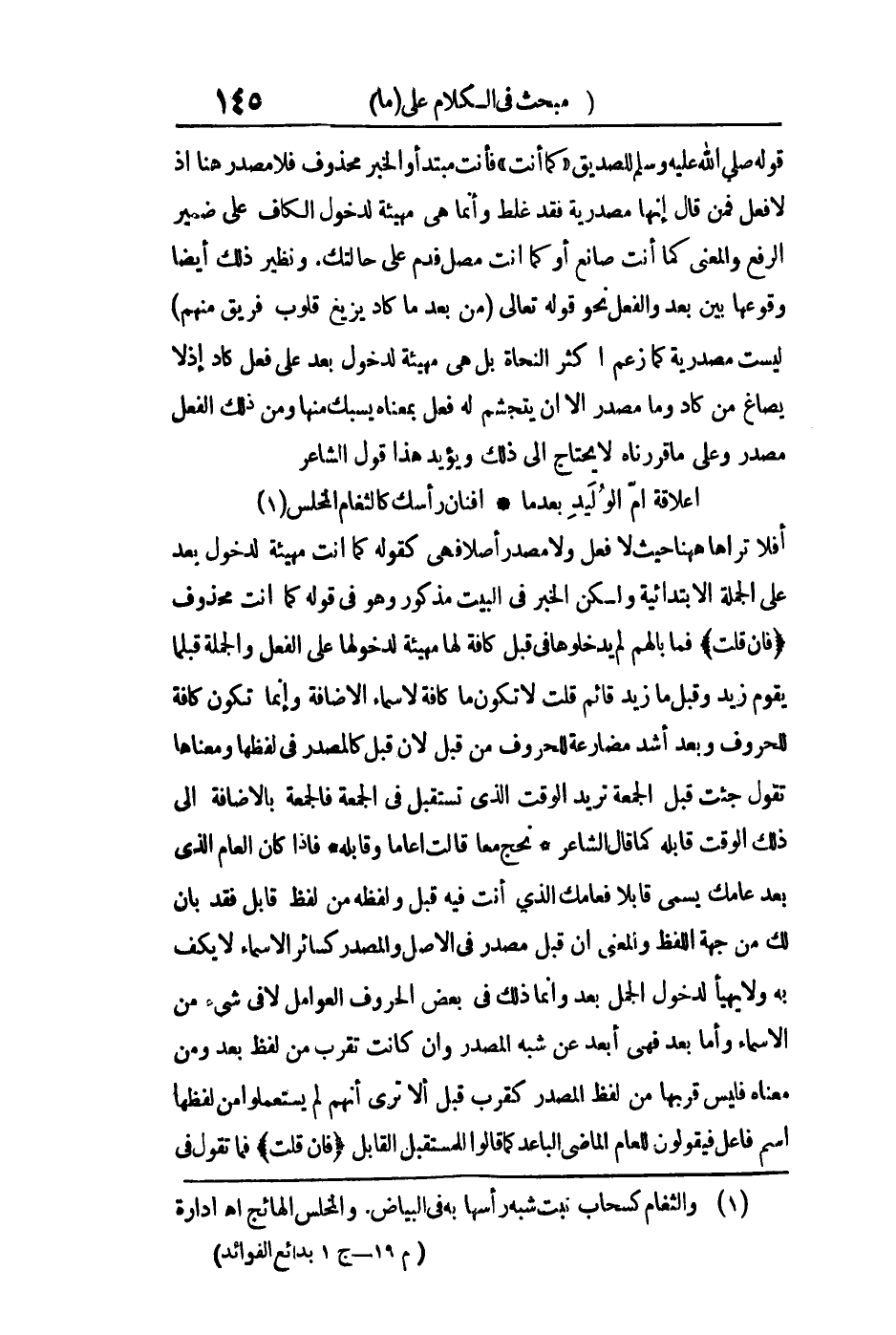 قوله للصديق "كما أنت " رواه الطبراني فأنت مبتدأ والخبر محذوف فلا مصدر هنا إذ لا فعل فمن قال إنها مصدرية فقد غلط وإنما هي مهيأة لدخول الكاف على ضمير الرفع والمعنى كما أنت صانع أو كما أنت مصل فدم على حالتك ونظير ذلك أيضا وقوعها بين بعد والفعل نحو قوله تعالى: {مِنْ بَعْدِ مَا كَادَ يَزِيغُ قُلُوبُ فَرِيقٍ مِنْهُمْ} ليست مصدرية كما زعم أكثر النحاة بل هي مهيأة لدخول بعد على فعل كاد إذ لا يصاغ من كاد وما مصدر إلا أن يتجشم له فعل بمعناه يسبك منها ومن ذلك الفعل مصدر وعلى ما قررناه لا يحتاج إلى ذلك ويؤيد هذا قول الشاعر: