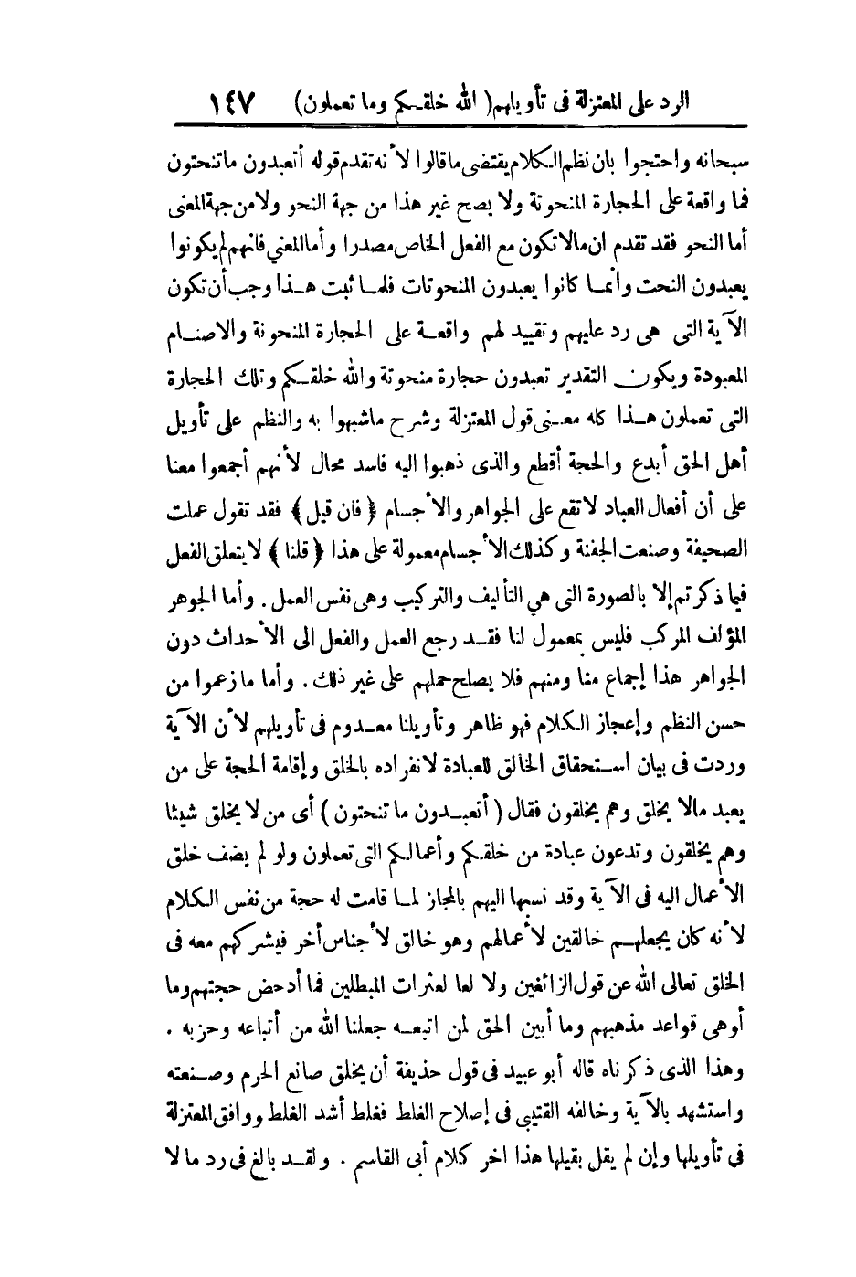 سبحانه واحتجوا بأن نظم الكلام يقتضي ما قالوا لأنه تقدم قوله: {قَالَ أَتَعْبُدُونَ مَا تَنْحِتُونَ} فما واقعة على الحجارة المنحوتة ولا يصح غير هذا من جهة النحو ولا من جهة المعنى أما النحو فقد تقدم أن ما لا تكون مع الفعل الخاص مصدرا وأما المعنى فإنهم لم يكونوا يعبدون النحت وإنما كانوا يعبدون المنحوتات فلما ثبت هذا وجب أن تكون الآية التي هي رد عليهم وتقييد لهم واقعة على الحجارة المنحوتة والأصنام المعبودة ويكون التقدير تعبدون حجارة منحوتة والله خلقكم وتلك الحجارة التي تعملون هذا كله معنى قول المعتزلة وشرح ما شبهوا به والنظم على تأويل أهل الحق أبدع والحجة أقطع والذي ذهبوا إليه فاسد محال لأنهم أجمعوا معنا على أن أفعال العباد لا تقع على الجواهر والأجسام فإن قيل: فقد تقول عملت الصحيفة وصنعت الجفنة وكذلك الأجسام معمولة على هذا قلنا: لا يتعلق الفعل فيما ذكرتم إلا بالصورة التي هل التأليف والتركيب وهي نفس العمل وأما الجوهر المؤلف المركب فليس بمعمول لنا فقد رجع العمل والفعل إلى الأحداث دون الجواهر هذا إجماع منا ومنهم فلا يصلح حملهم على غير ذلك وأما ما زعموا من حسن النظم وإعجاز الكلام فهو ظاهر وتأويلنا معدوم في تأويلهم لأن الآية وردت في بيان استحقاق الخالق للعبادة لانفراده بالخلق وإقامة الحجة على من يعبد ما لا يخلق وهم يخلقون فقال: {أَتَعْبُدُونَ مَا تَنْحِتُونَ} أي من لا يخلق شيئا وهم يخلقون وتدعون عبادة من خلقكم وأعمالكم التي تعملون ولو لم يضف خلق الأعمال إليه في الآية وقد نسبها إليهم بالمجاز لما قامت له حجة من نفس الكلام لأنه كان يجعلهم خالقين لأعمالهم وهو خالق لأجناس أخرى فيشركهم معه في الخلق تعالى الله عن قول الزائغين ولا لعثرات المبطلين فما أدحض حجتهم وما أوهى قواعد مذهبهم وما أبين الحق لمن اتبعه جعلنا الله من أتباعه وحزبه وهذا الذي ذكرنا قاله أبو عبيد في قول حذيفة أن يخلق صانع الجرم وصنعته واستشهد بالآية وخالفه القتيبي في إصلاح الغلط فغلط أشد الغلط ووافق المعتزلة في تأويلها وإن لم يقل بقيلها هذا آخر كلام أبي القاسم ولقد بالغ في رد ما لا