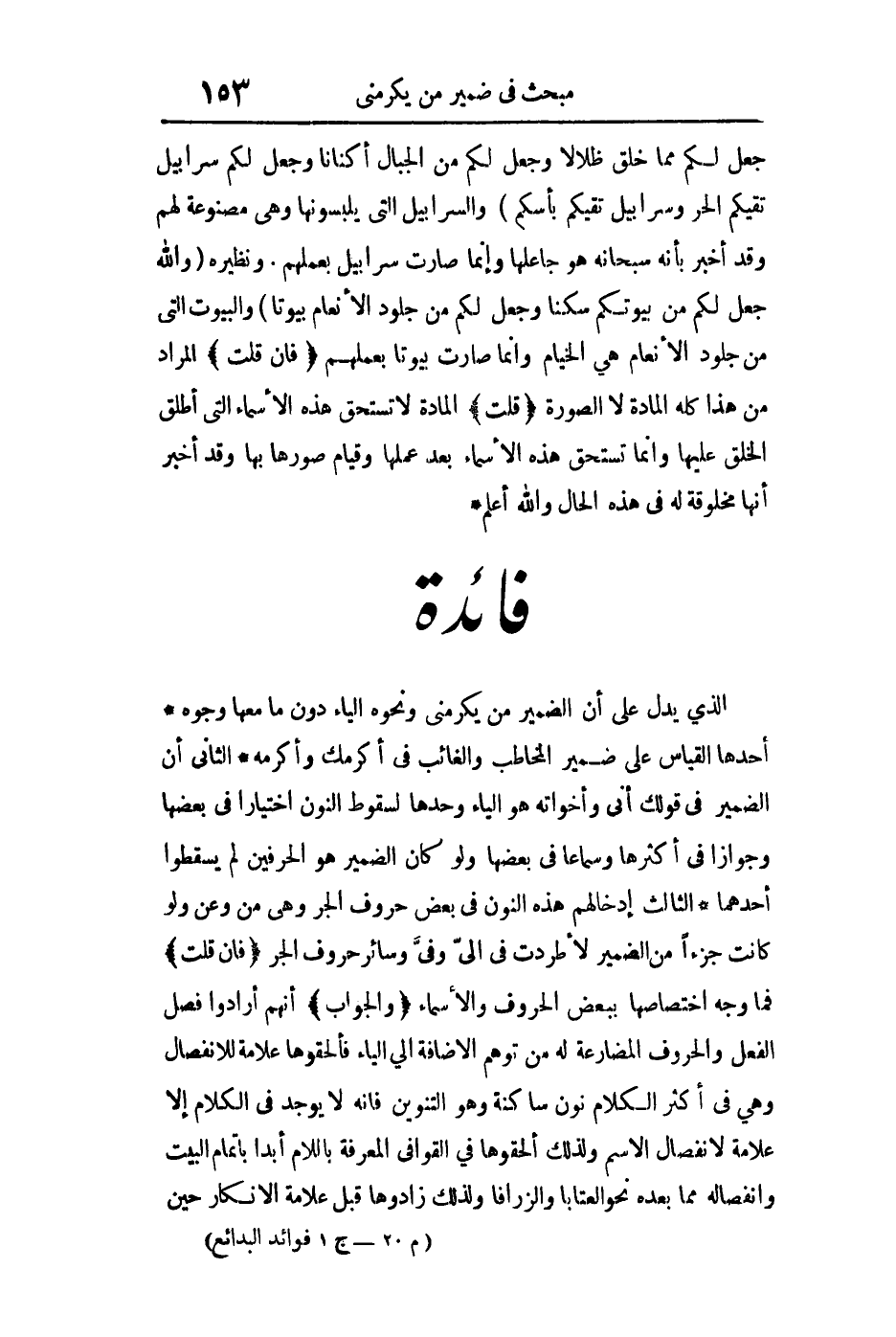 الذي يدل على أن الضمير من يكرمني ونحوه هو الياء دون ما معها وجوه أحدها القياس على ضمير المخاطب والغائب في أكرمك وأكرمه والثاني: أن الضمير في قولك إني وأخواته هو الياء وحدها لسقوط النون اختيارا في بعضها وجوازا في أكثرها وسماعا في بعضها ولو كان الضمير هو الحرفين لم يسقطوا أحدهما والثالث: إدخالهم هذه النون في بعض حروف الجر وهي من وعن ولو كانت جزءا من الضمير لأطردت في إلى وفي وسائر حروف الجر فإن قلت: فما وجه اختصاصها ببعض الحروف والأسماء الجواب: أنهم أرادوا فصل الفعل والحروف المضارعة له من توهم الإضافة إلى الياء فألحقوها علامة للانفصال وهي في أكثر الكلام نون ساكنة وهو التنوين فإنه لا يوجد في الكلام إلا علامة لانفصال الاسم ولذلك ألحقوها في القوافي المعرفة باللام أبدا بإتمام البيت وانفصاله مما بعده نحو العتابا والزرافا ولذلك زادوها قبل علامة الإنكار حين