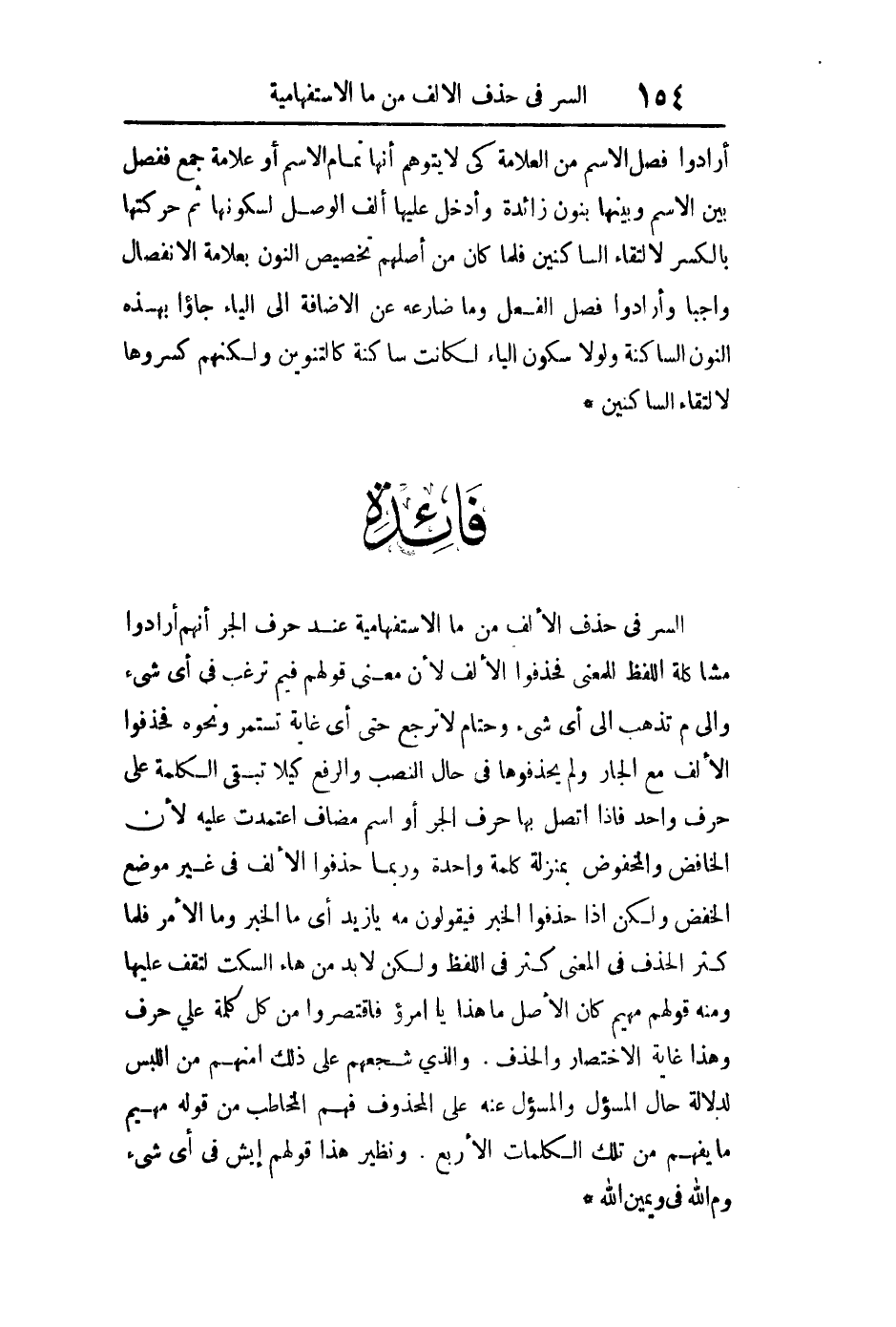 السر في حذف الألف من ما الاستفهامية عند حرف الجر أنهم أرادوا مشاكلة اللفظ للمعنى فحذفوا الألف لأن معنى قولهم فيم ترغب في أي شيء وإلام تذهب إلى أي شيء وحتام لا ترجع حتى أي غاية تستمر ونحوه فحذفوا الألف مع الجار ولم يحذفوها في حال النصب والرفع كيلا تبقى الكلمة على حرف واحد فإذا اتصل بها حرف الجر أو اسم مضاف اعتمدت عليه لأن الخافض والمخفوض بمنزلة كلمة واحدة وربما حذفوا الألف في غير موضع الخفض ولكن إذا حذفوا الخبر فيقولون مه يا زيد أي ما الخبر وما الأمر فلما كثر الحذف في المعنى كثر في اللفظ ولكن لا بد من هاء السكت لتقف عليها ومنه قولهم مهيم كان الأصل ما هذا يا امرؤ فاقتصروا من كل كلمة على حرف وهذا غاية الاختصار والحذف والذي شجعهم على ذلك أمنهم من اللبس لدلالة حال المسئول والمسئول عنه على المحذوف فهم المخاطب من قوله مهيم ما يفهم من تلك الكلمات الأربع ونظير هذا قولهم إيش في أي شيء وم الله في يمين الله